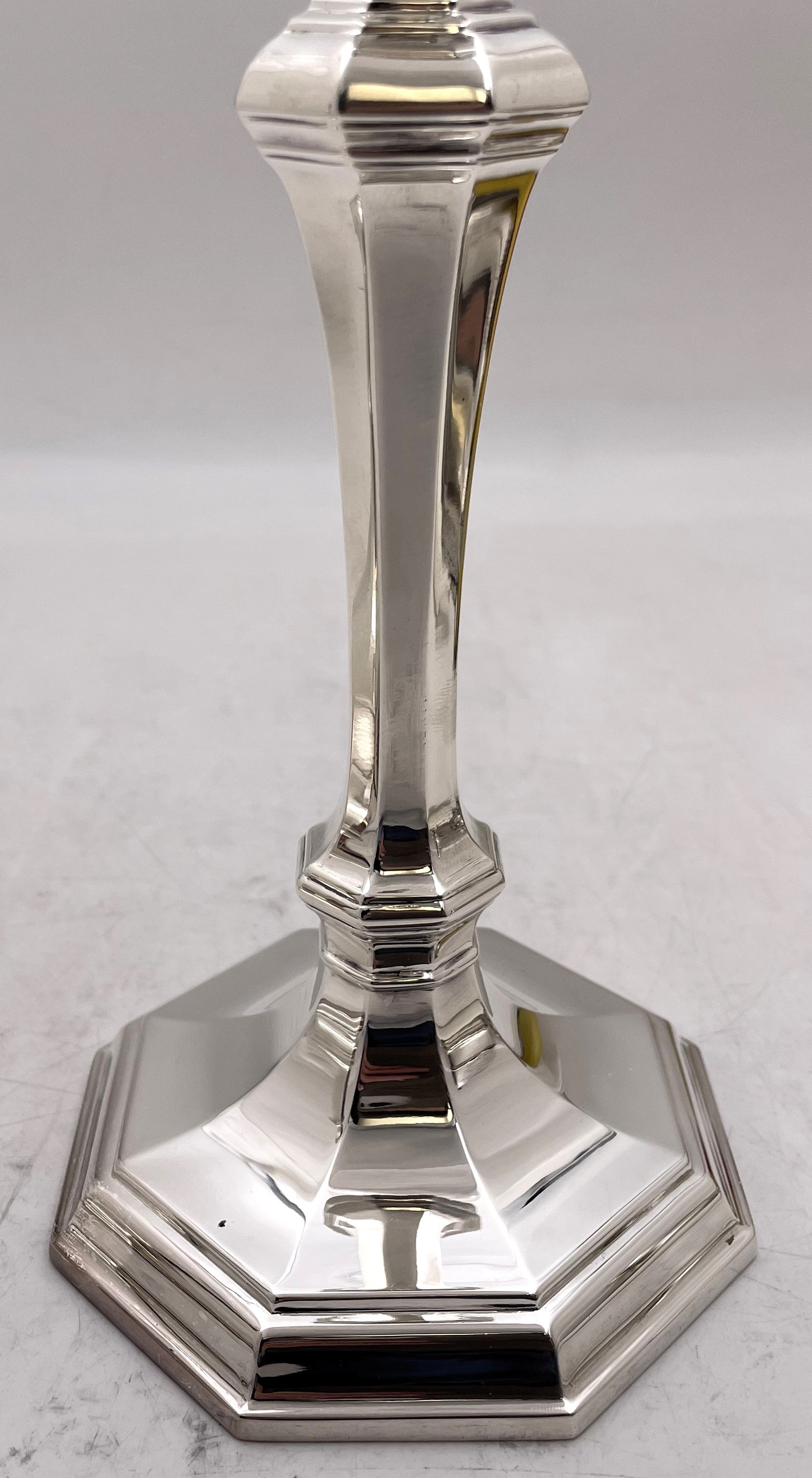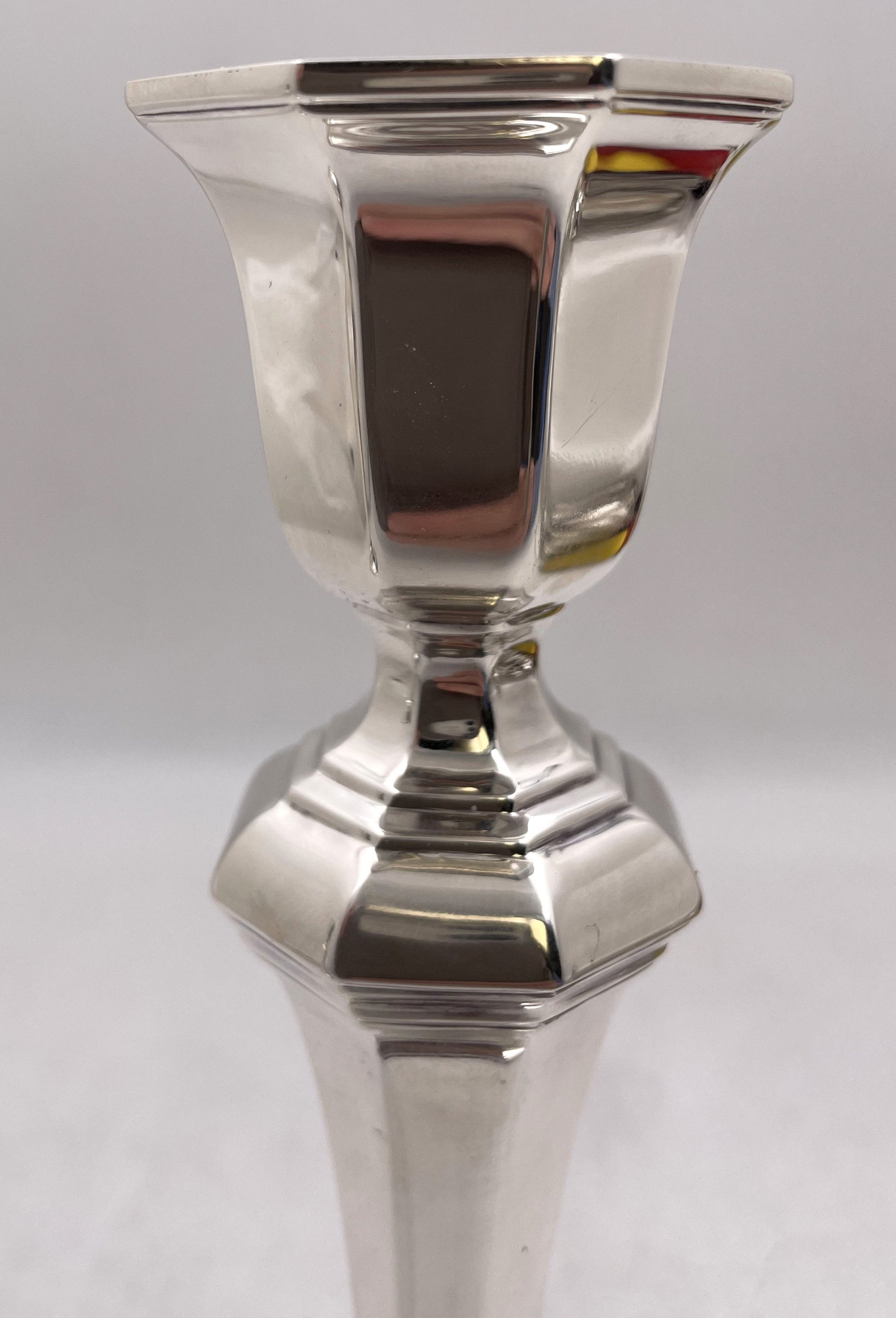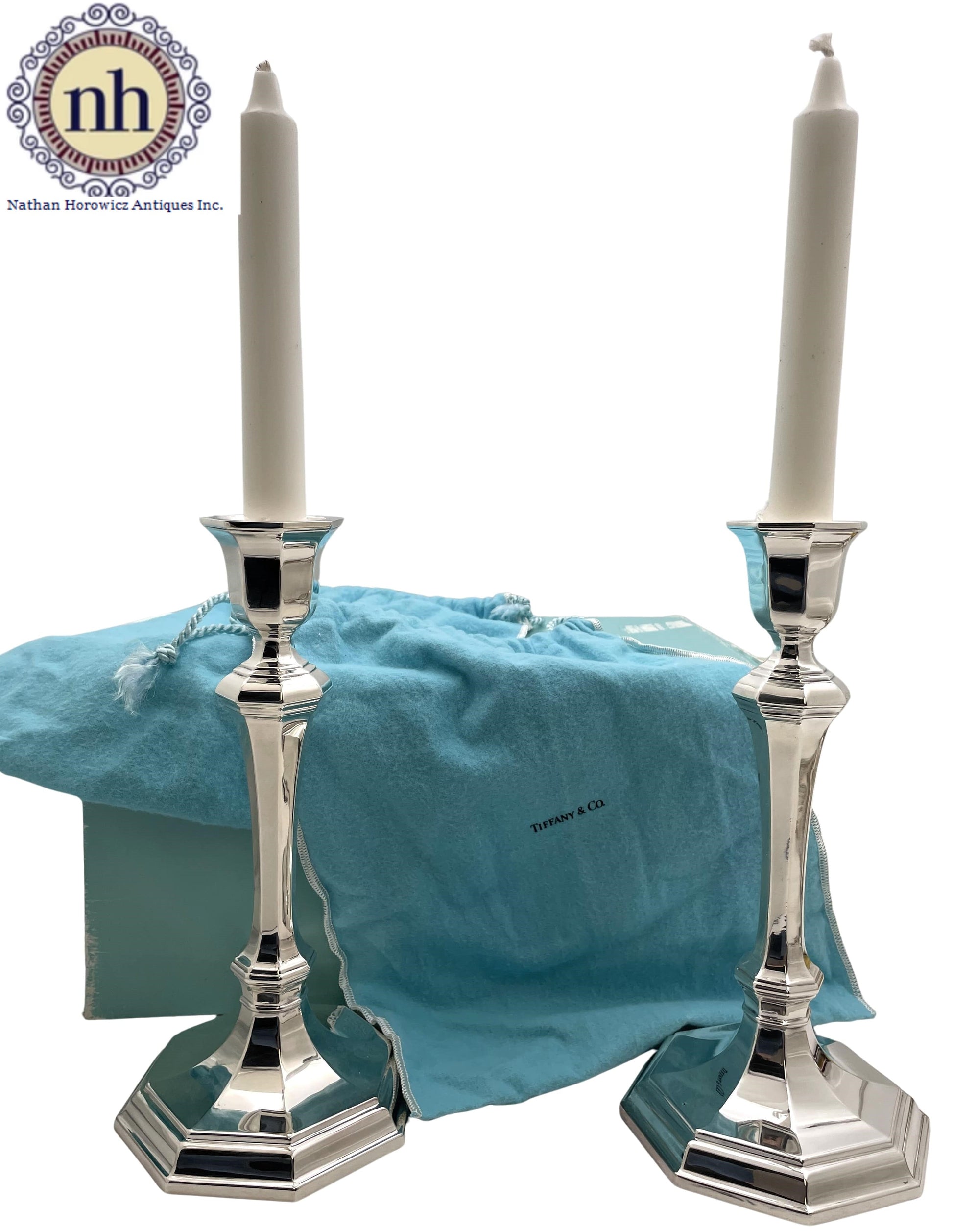 Pair of Tiffany & Co. sterling silver candlesticks in Mid-Century Modern style, with an elegant, geometric design, standing on a stepped octagonal base. They measure 9 2/3'' in height by 4 1/2'' in diameter at the base, weigh 22.9 troy ounces, and bears hallmarks as shown. They are sold in the original Tiffany blue pouches and box.