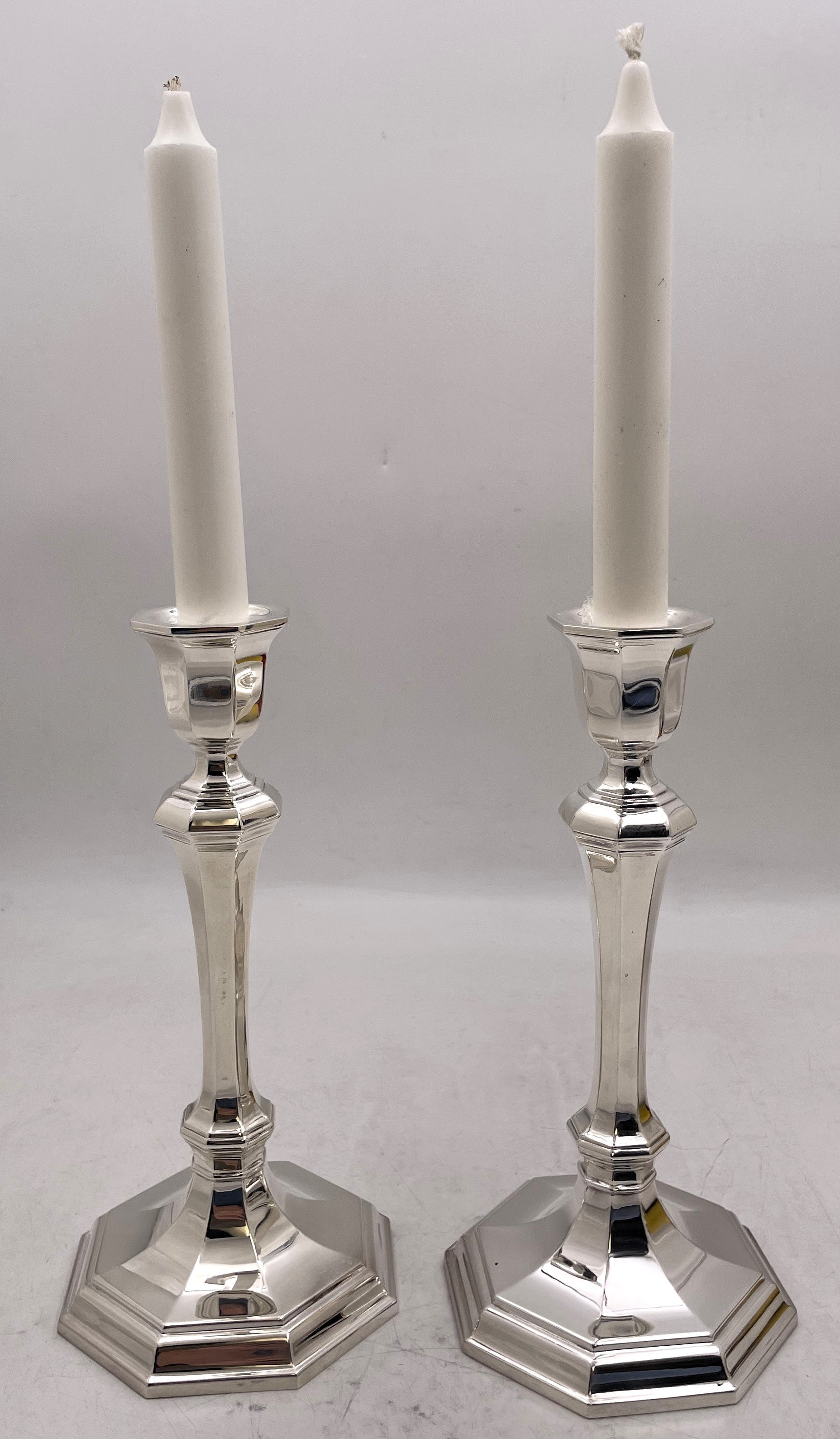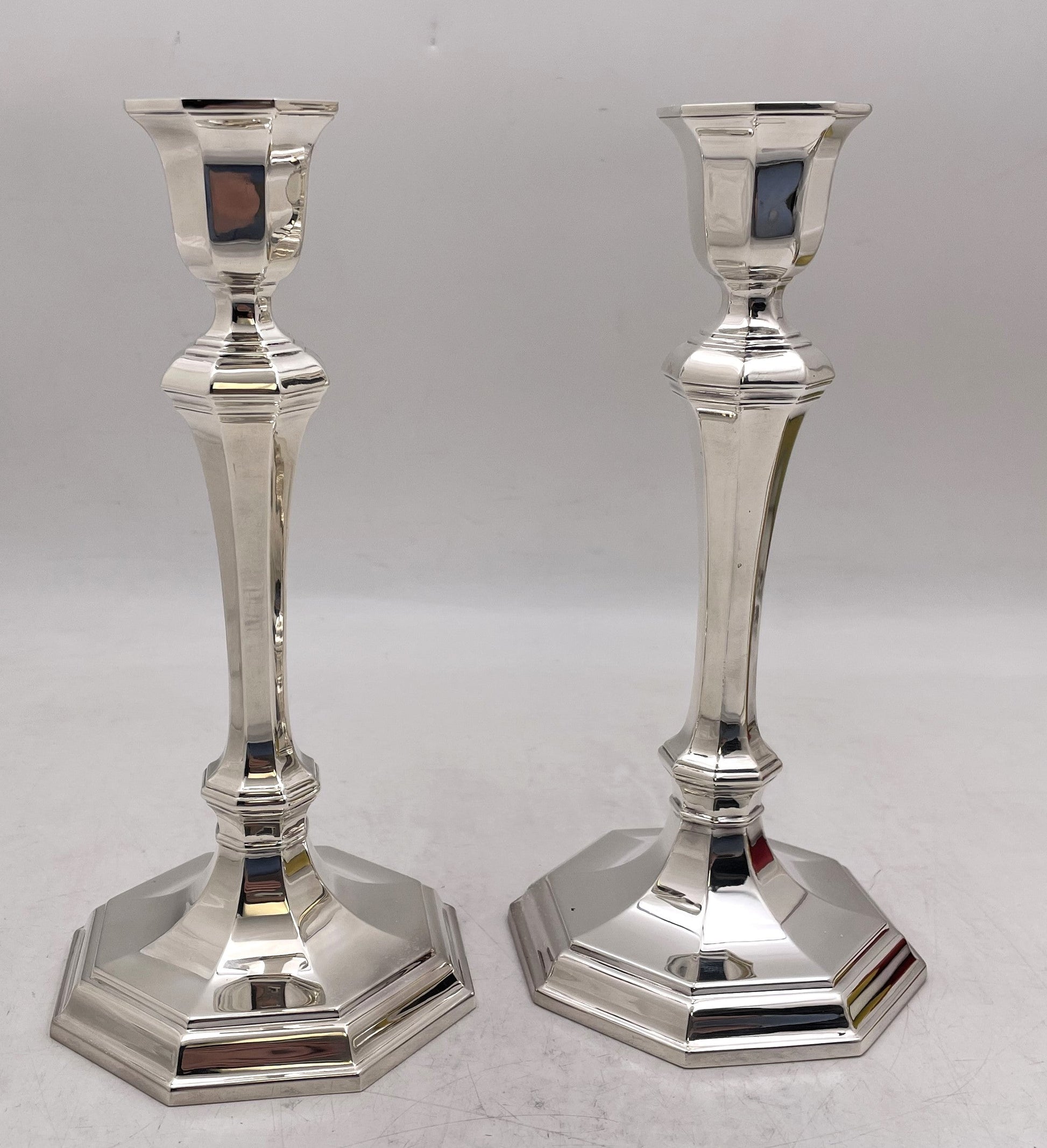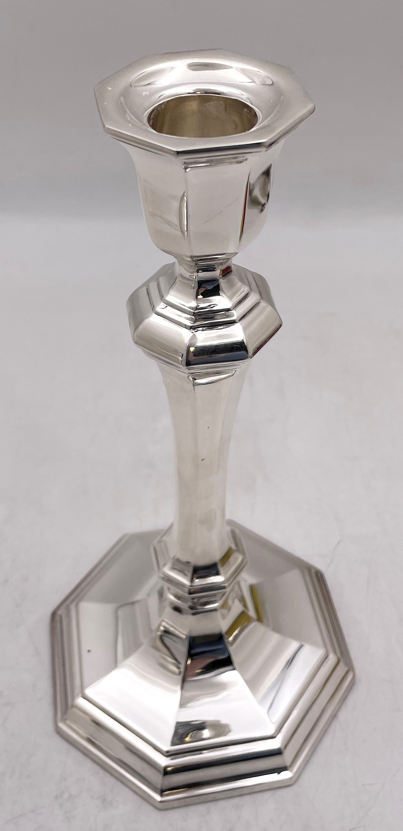 Pair of Tiffany & Co. sterling silver candlesticks in Mid-Century Modern style, with an elegant, geometric design, standing on a stepped octagonal base. They measure 9 2/3'' in height by 4 1/2'' in diameter at the base, weigh 22.9 troy ounces, and bears hallmarks as shown. They are sold in the original Tiffany blue pouches and box.