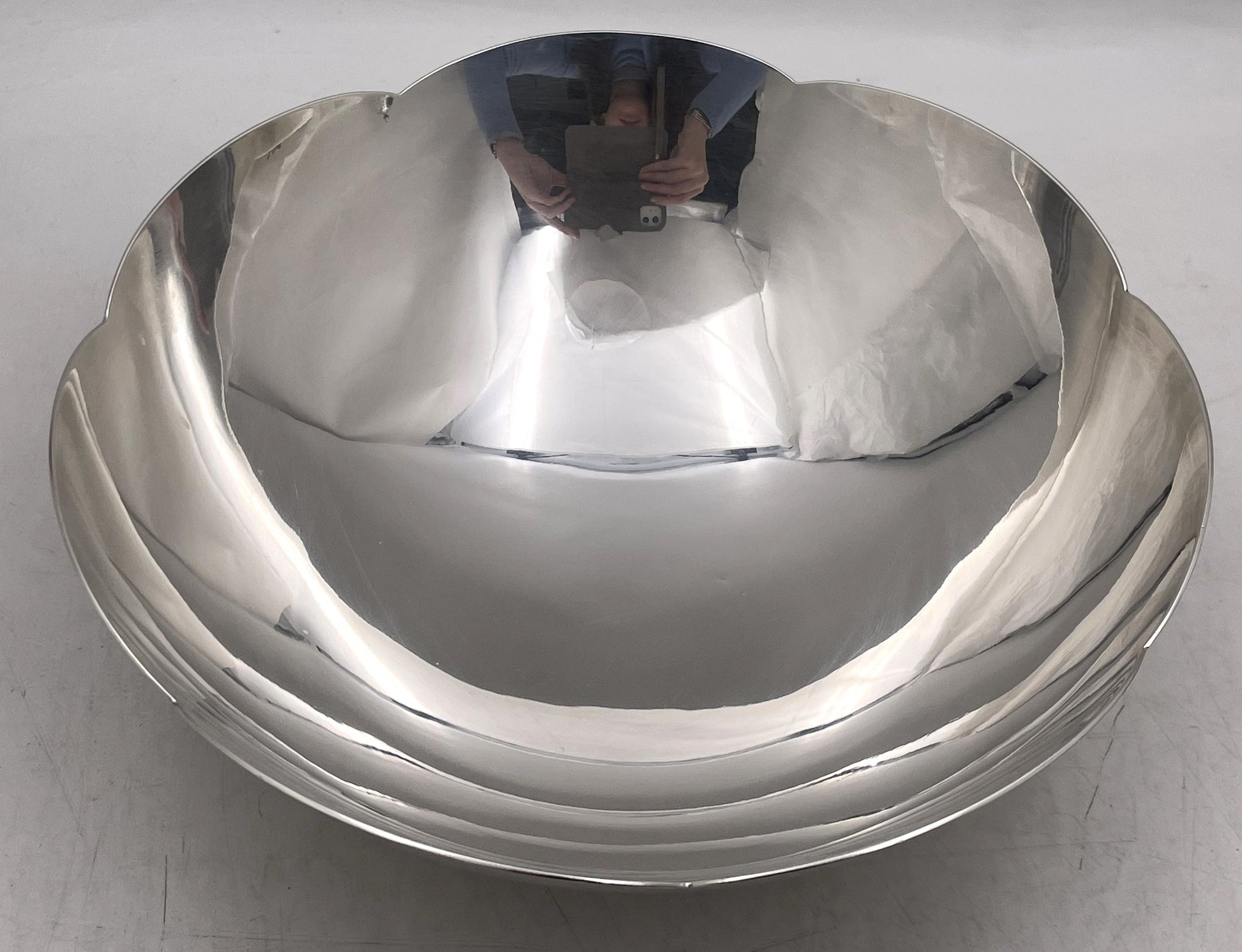 Tiffany & Co. sterling silver multi-lobed bowl, in Mid-Century Modern style, with an elegant, geometric design, and in pattern number 23843. It measures 8 7/8'' in diameter by 3 1/8'' in height, weighs 19.6 troy ounces, and bears hallmarks as shown. It is sold in its original Tiffany blue pouch and box.