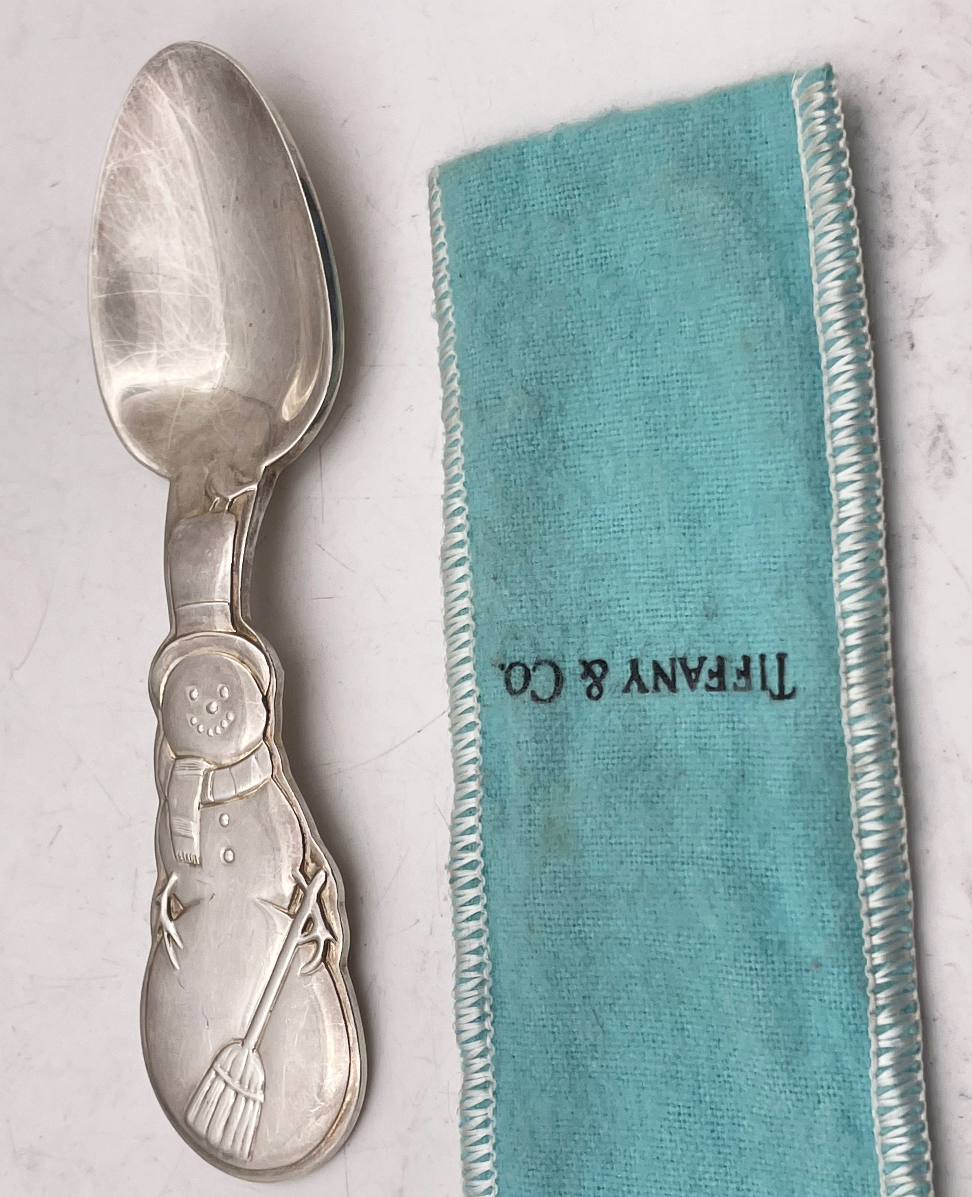 Tiffany & Co. sterling silver child spoon with a snowman motif, measuring 4 3/4'' in length by 1 1/8'' in width at the handle. Sold in its original blue pouch.
