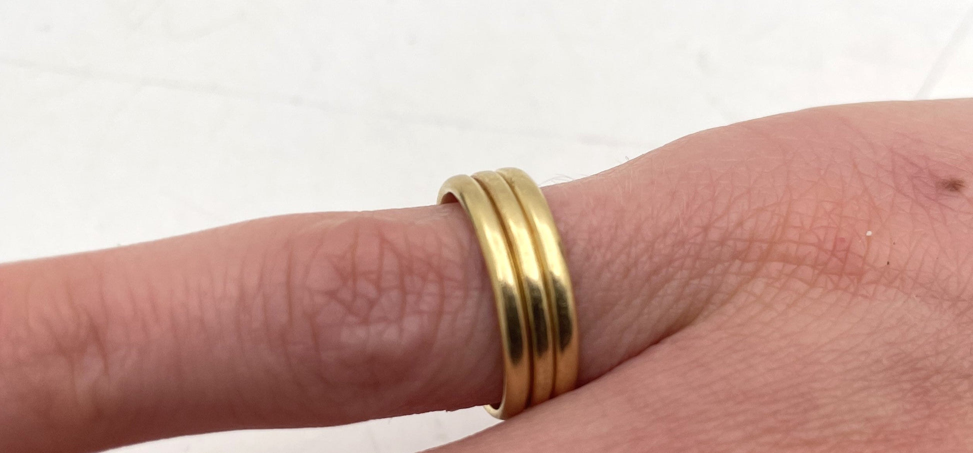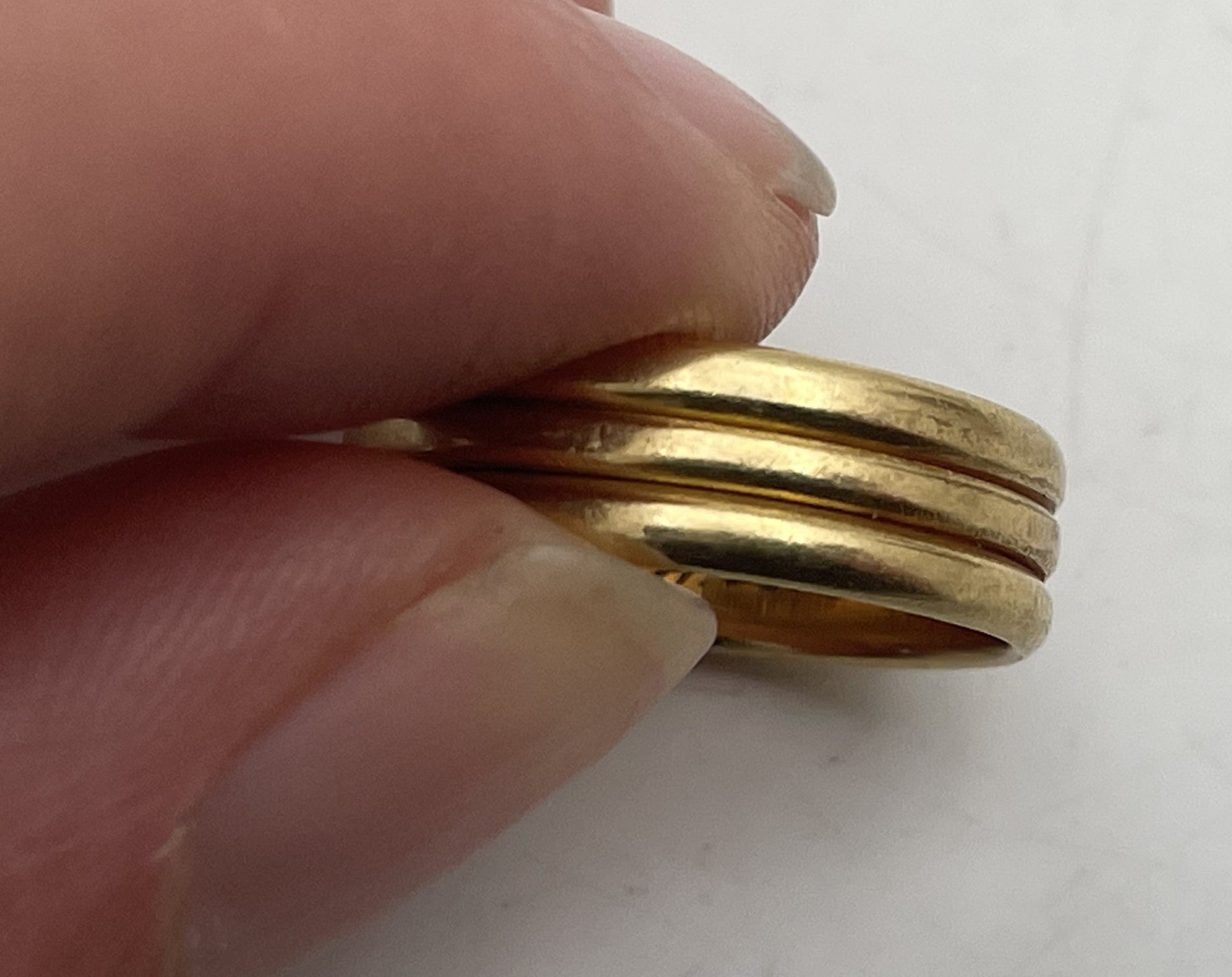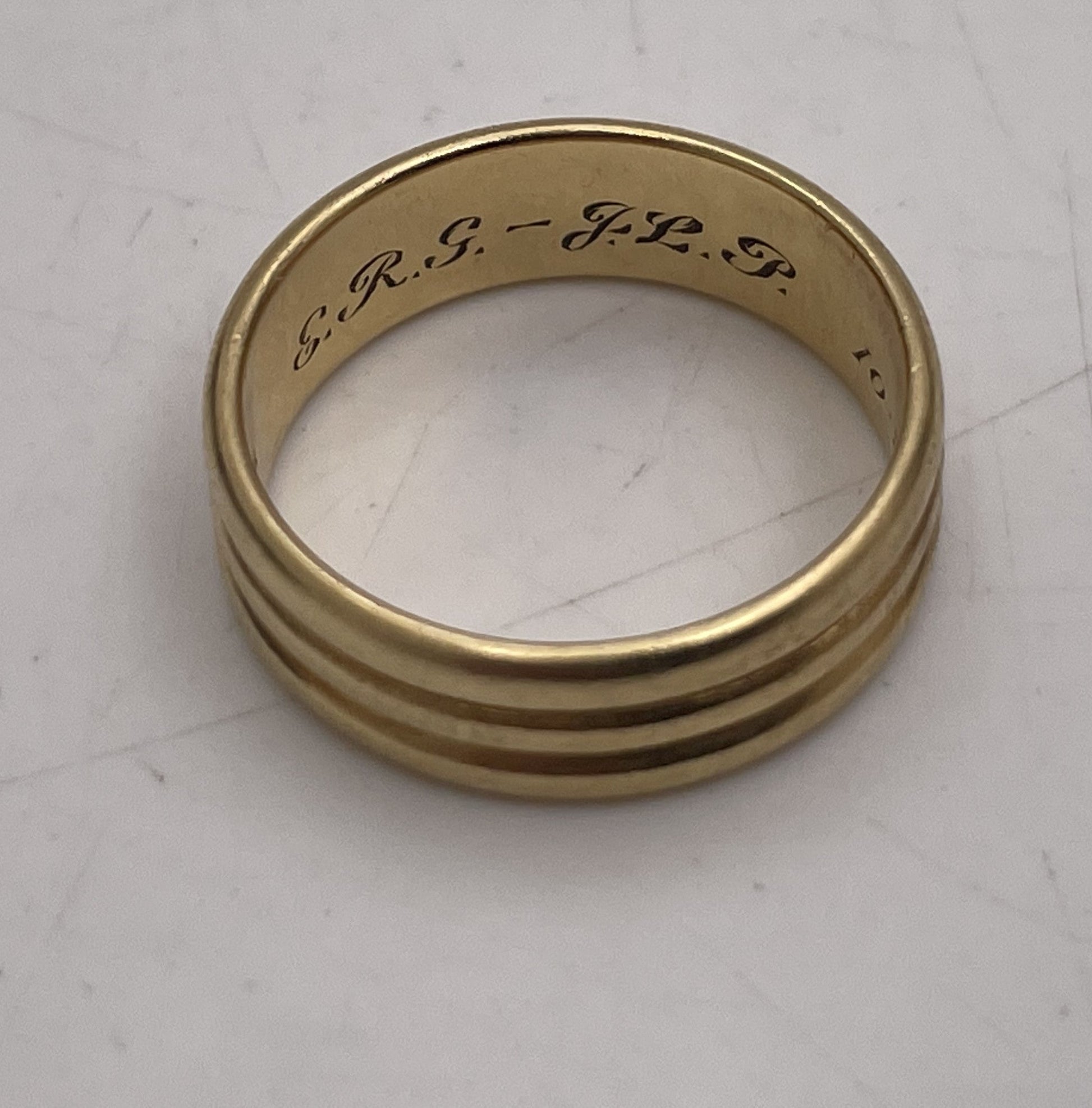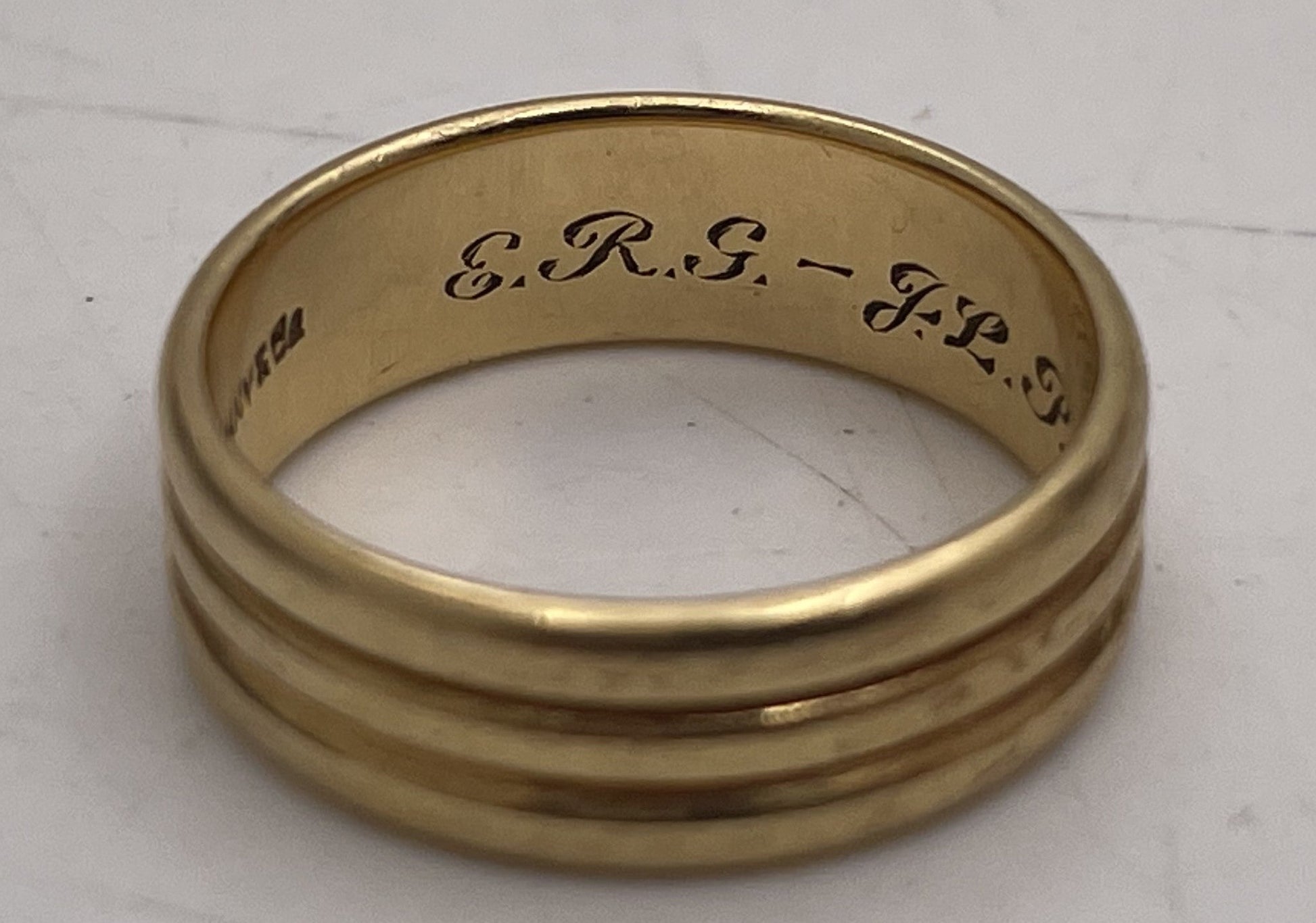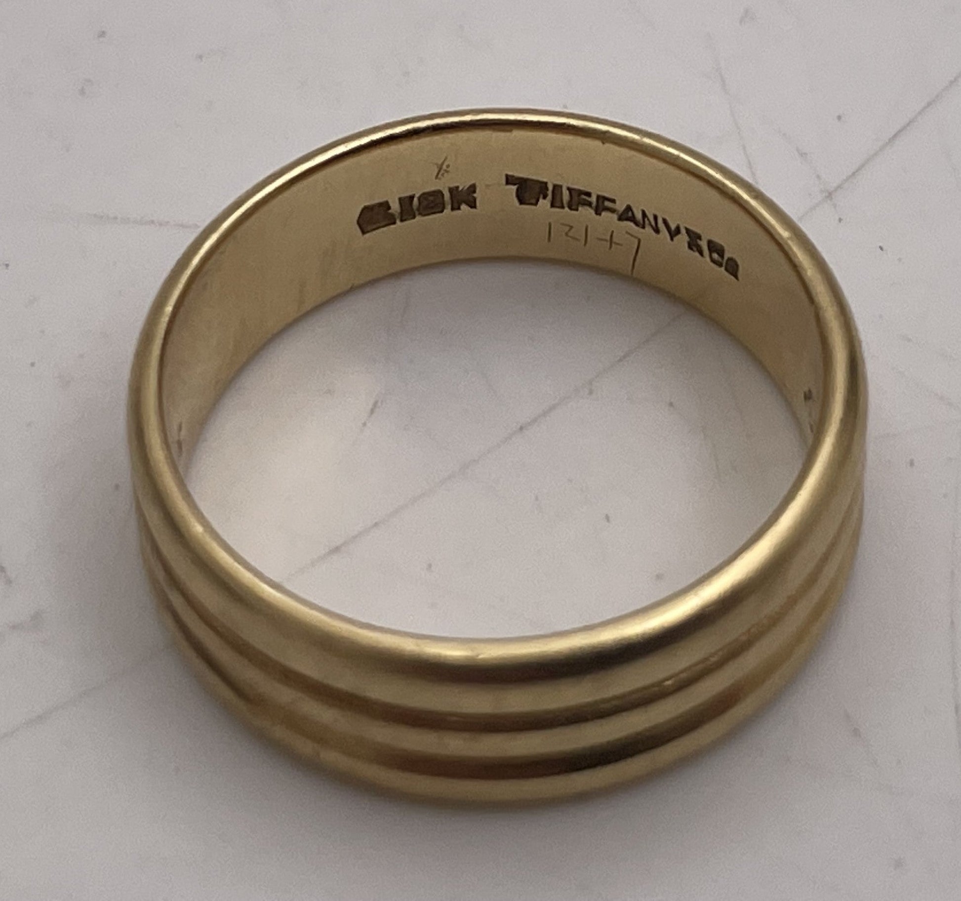 Tiffany & Co. 18k gold wedding band or ring with ribbed design. It is size 4 1/2, weighs 4.5 grams, and bears hallmarks as shown.