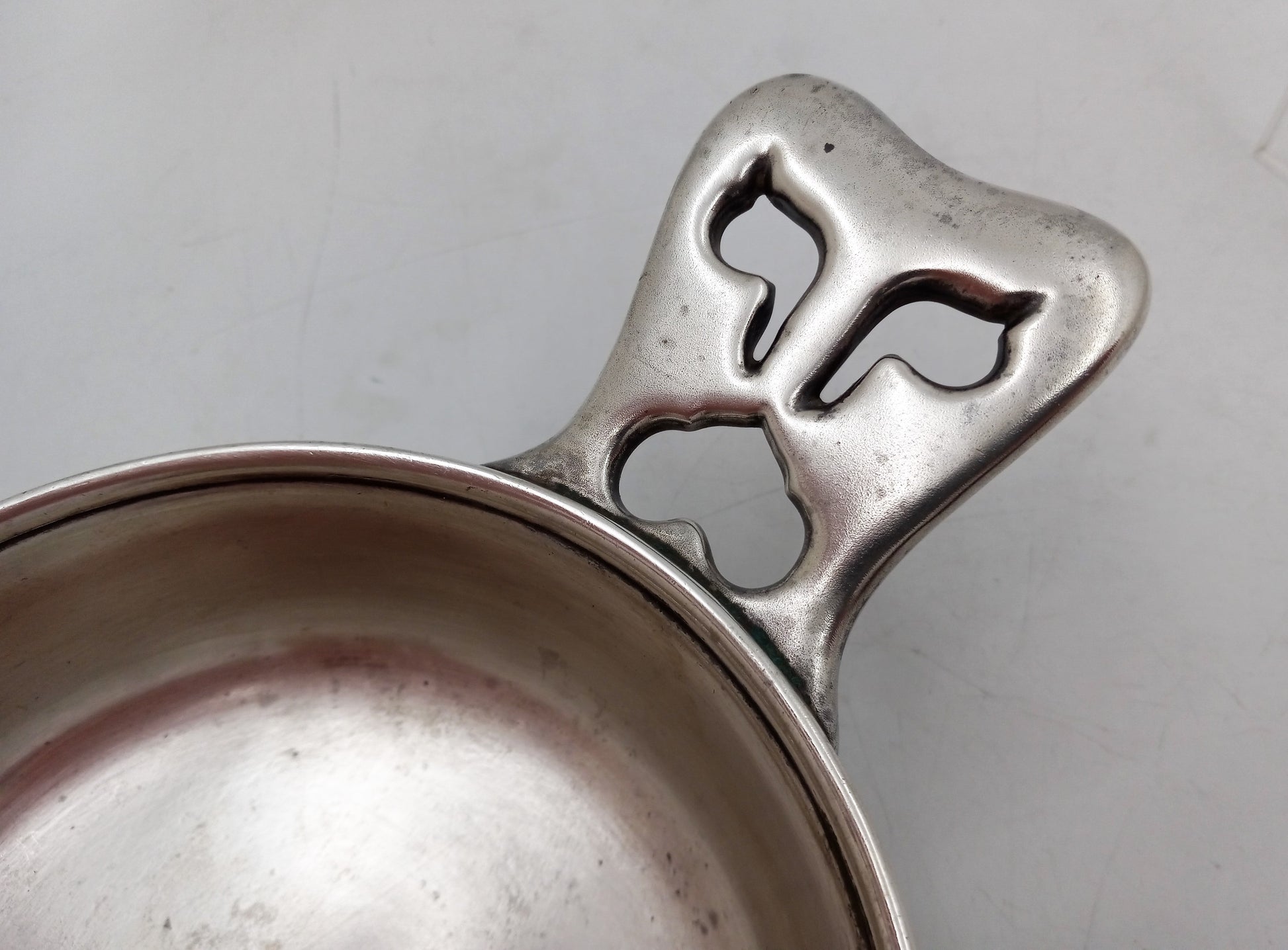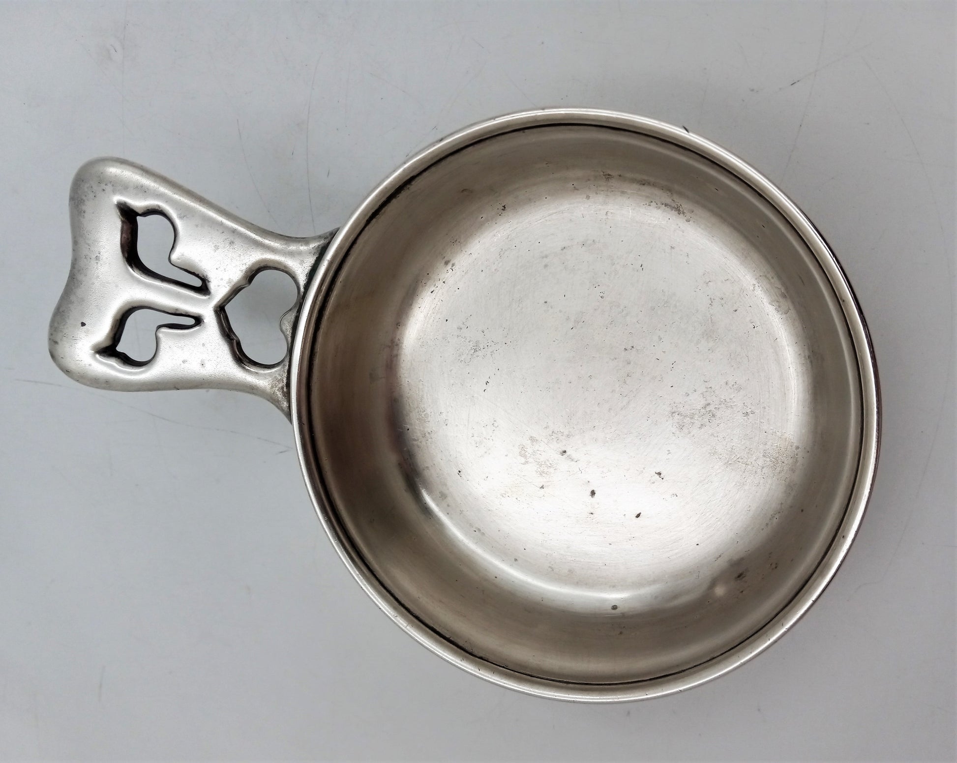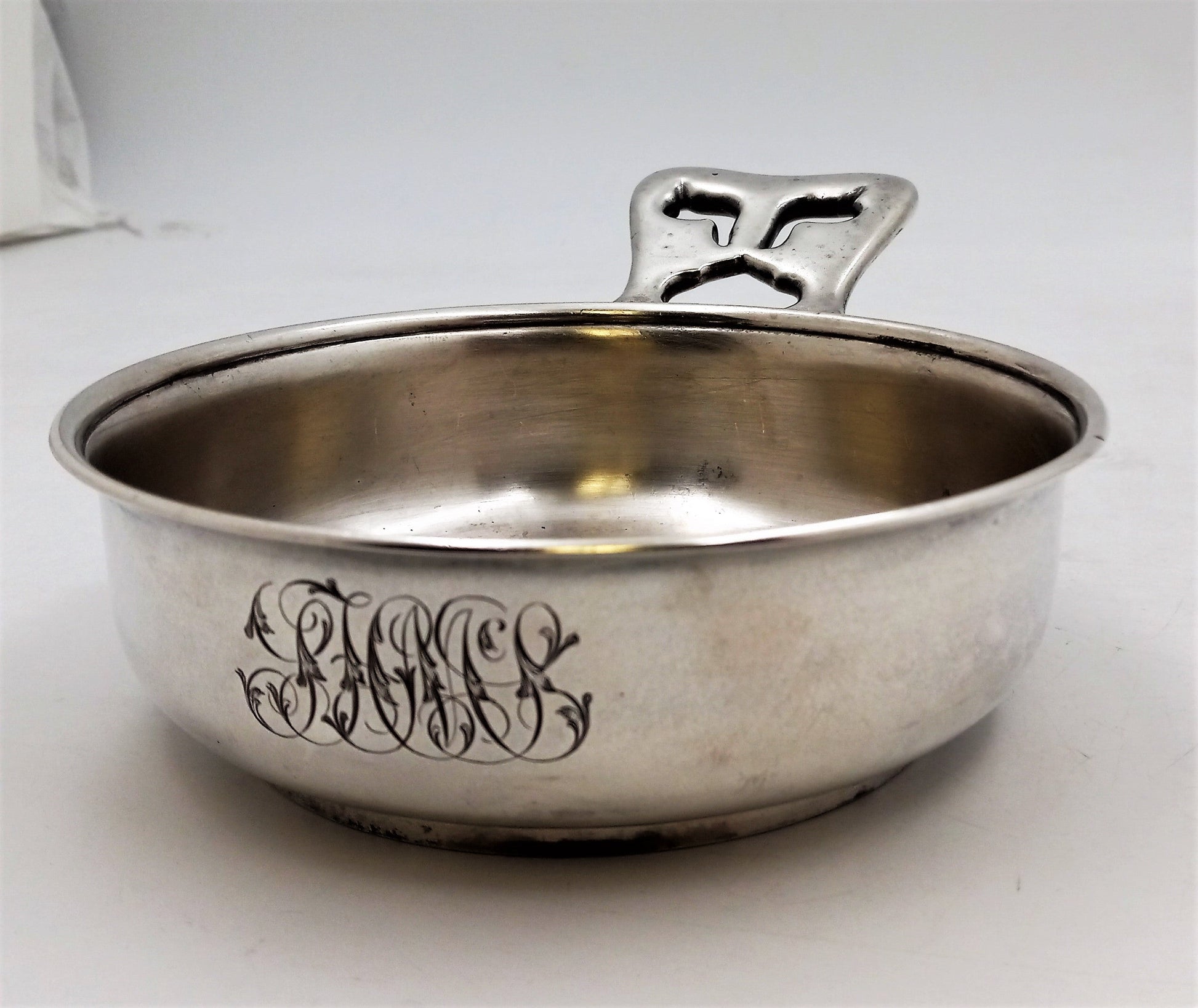 Tiffany & Co. aesthetic sterling silver porringer dish, circa 1880s. Measurements: 7 1/4" across (with handle); bowl is 5" across and 2" deep. Weight: 6.6 troy ounces. Bears hallmark as shown.
