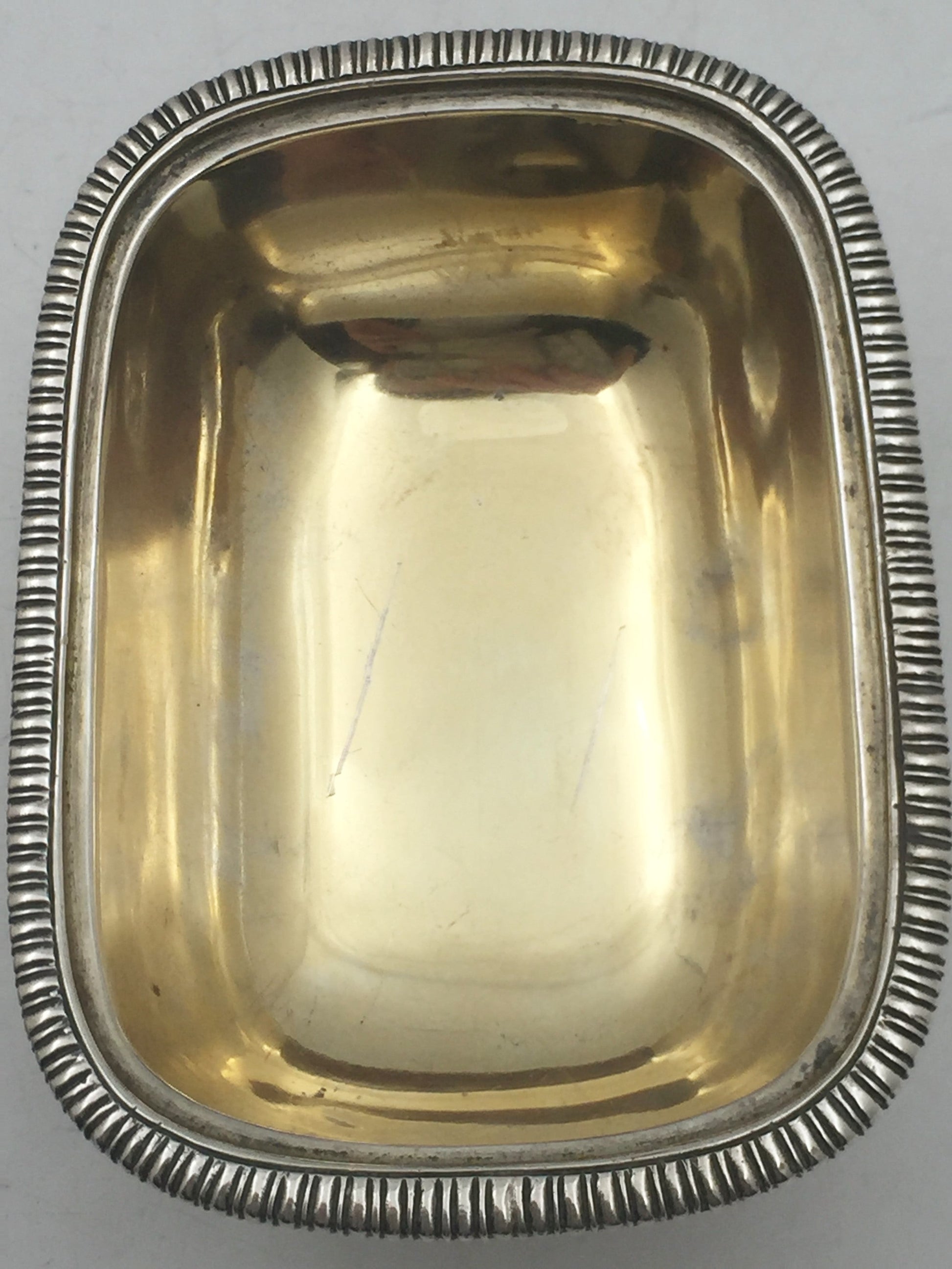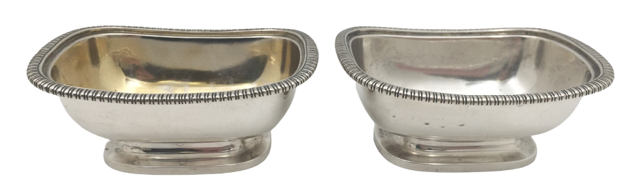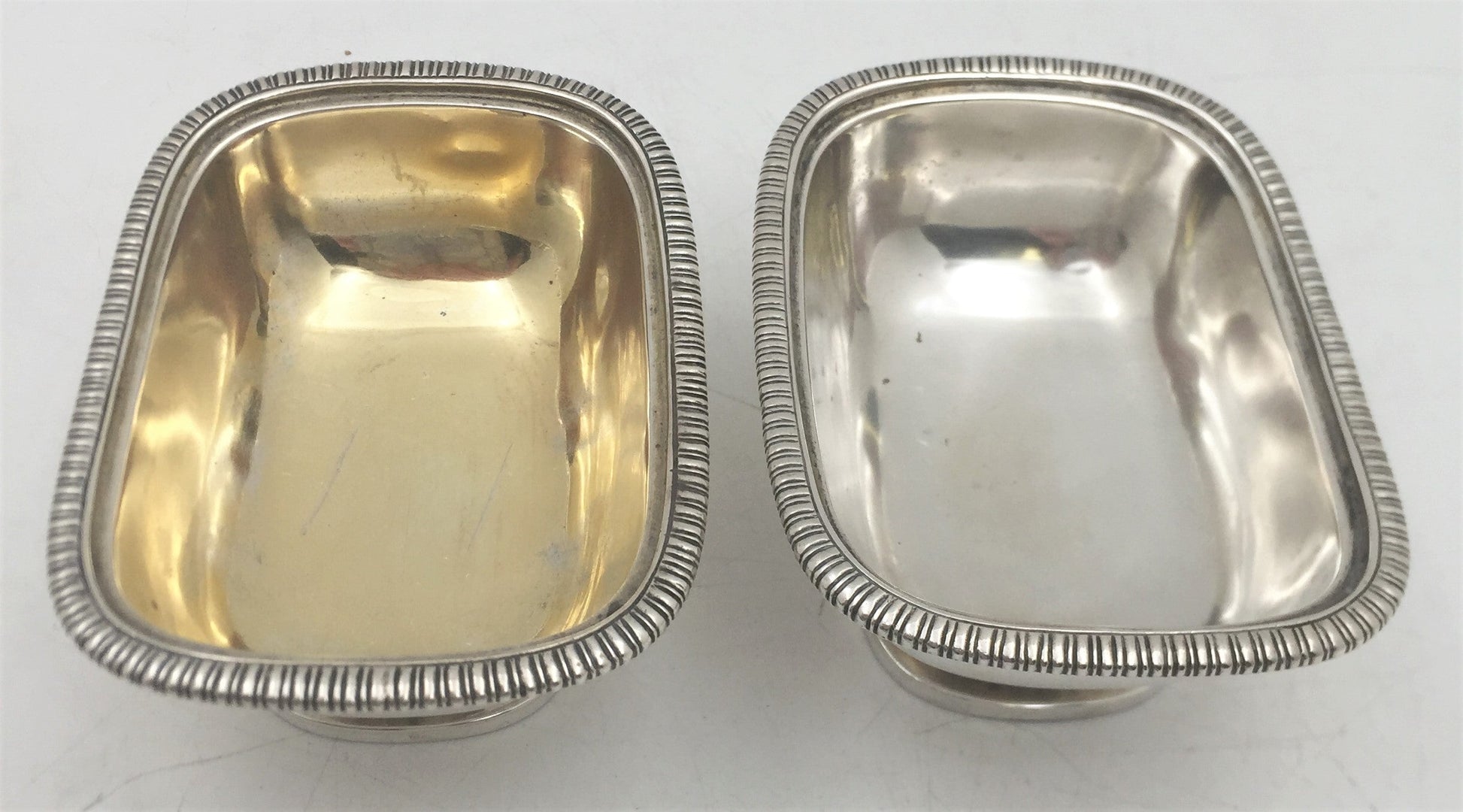 Tiffany & Co. sterling silver pair of open salts in pattern number 18854 from 1915, one with a gilt bowl, the other one not, with a gadrooned rim. Each measures 3 3/4'' in length by 2 7/8'' in width by 1 3/8'' in height and bears hallmarks as shown.
