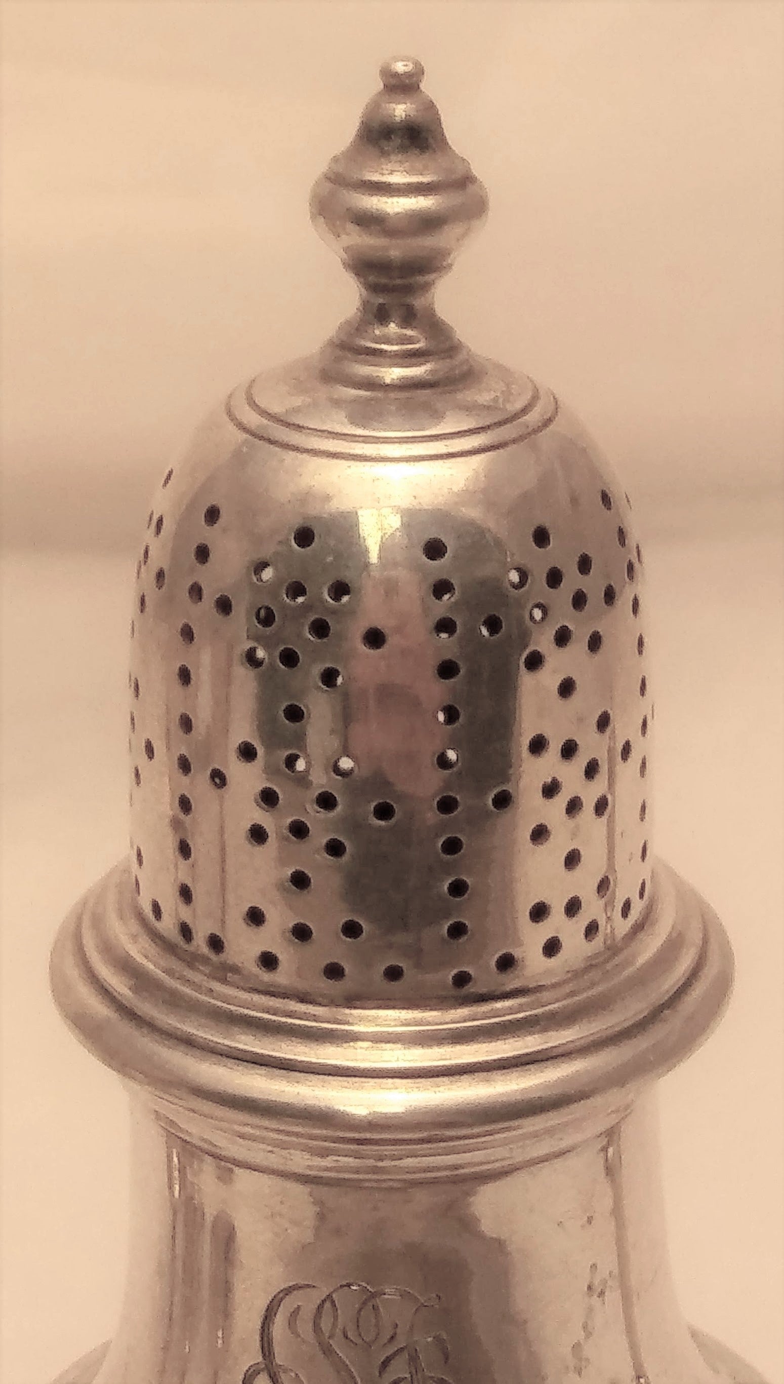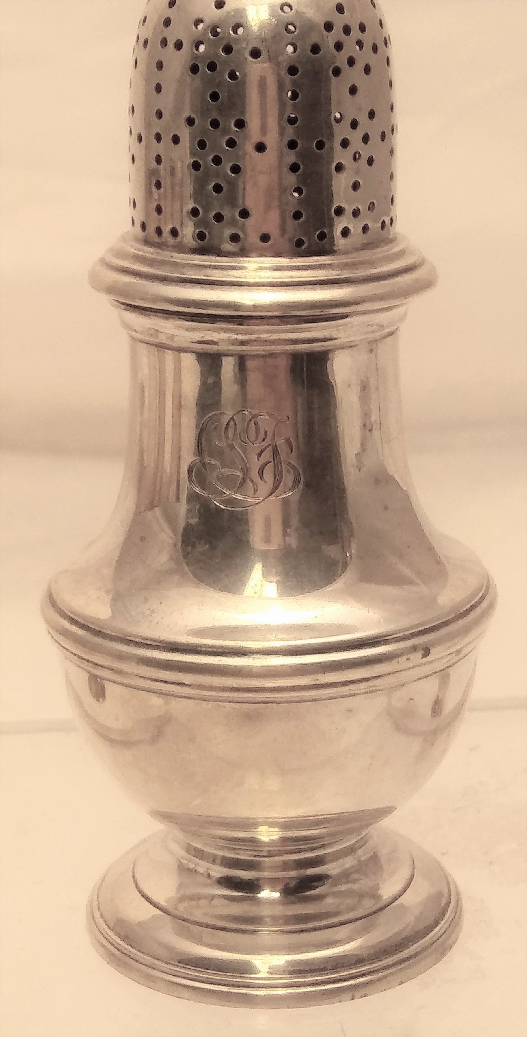 Pair of sterling silver Tiffany & Co. salt shakers, designed with finial atop and standing on base. Body of shakers designed in baluster form. Measuring 5 inches tall and 2 inches at widest point. Weighing 6.2 troy ounces. Bearing hallmarks and monograms as shown in images.
