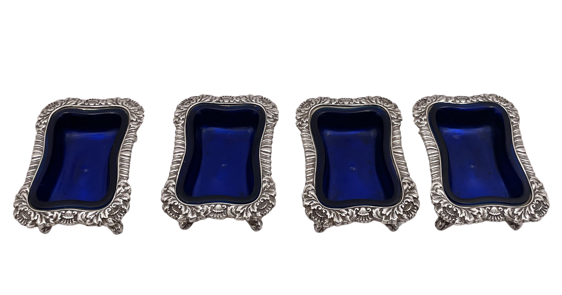 Tiffany & Co. Set of 4 Sterling Silver 1879 Open Salt Cellars with Blue Liners