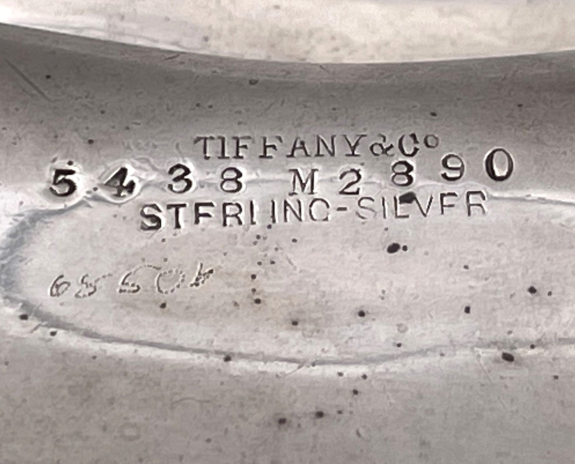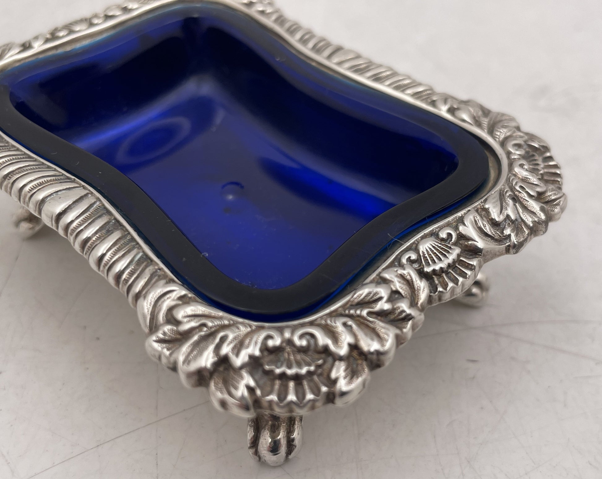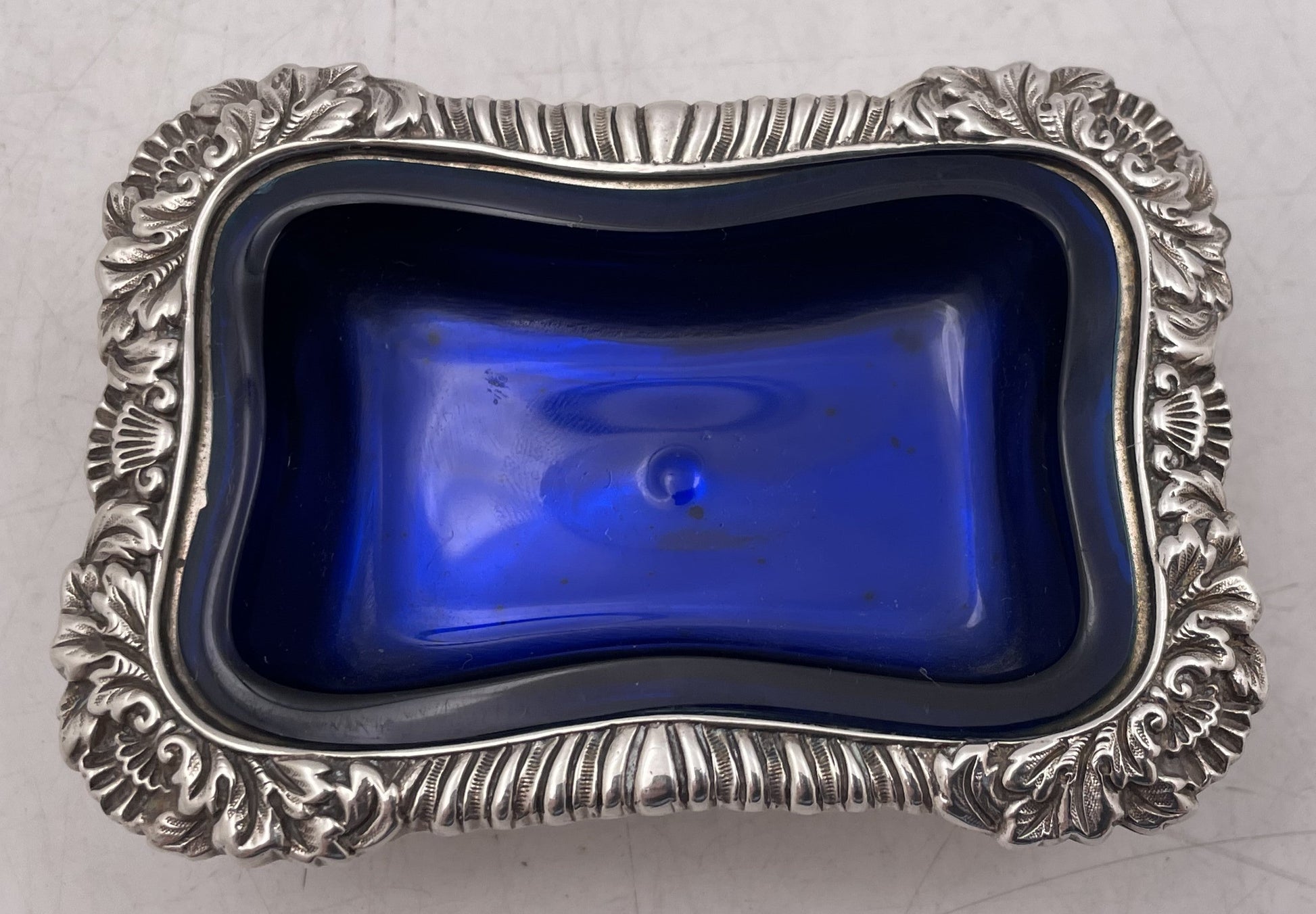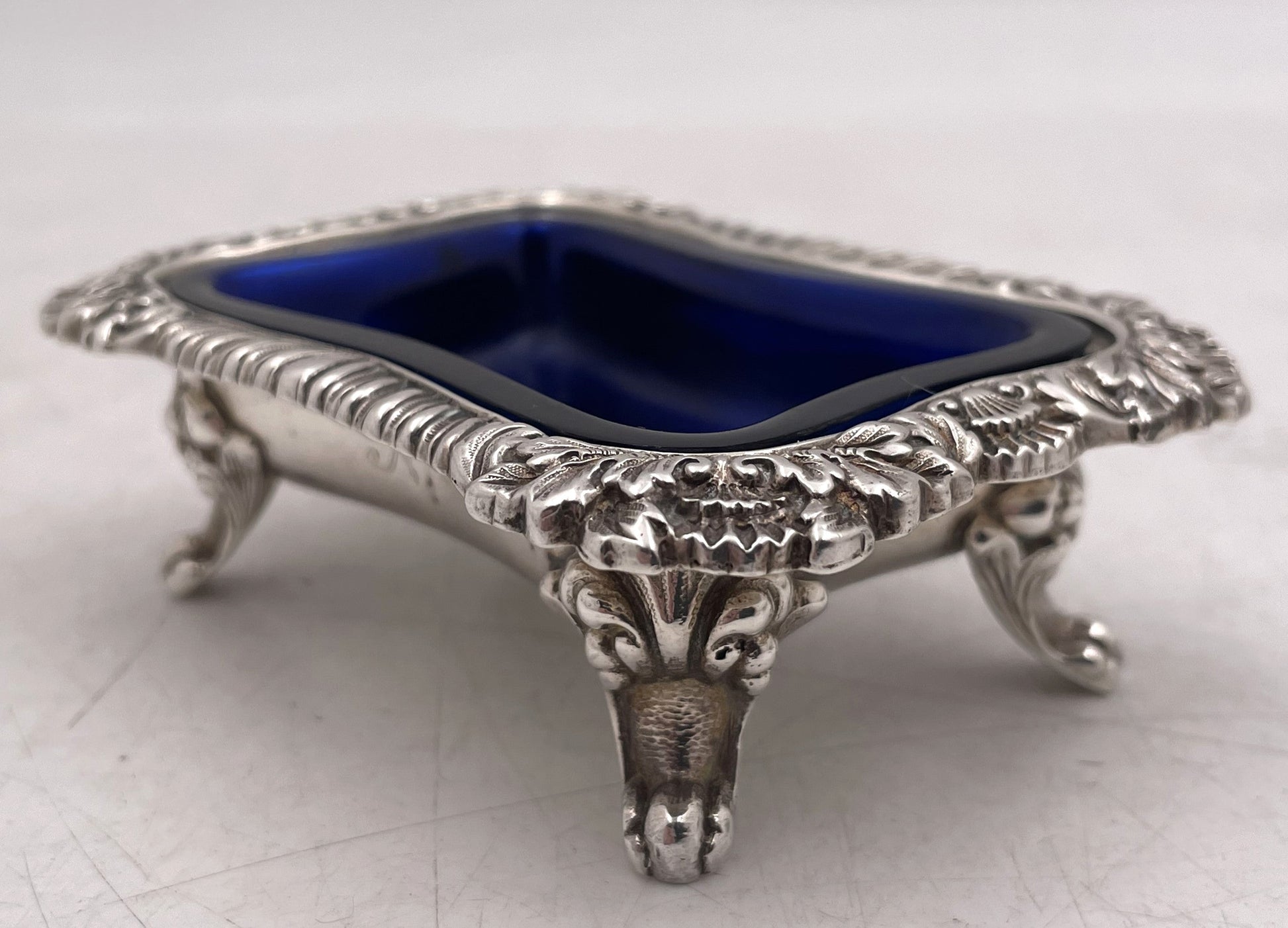 Tiffany & Co. set of 4 sterling silver open salt cellars with removable blue liners, in pattern number 5438 from 1879. Beautifully adorned with stylized geometric and floral motifs around the rims, they measure 3 2/3'' in width by 2 1/2'' in depth by 1 1/4'' in height. Total silver weight is 13.6 troy ounces. Hallmarks are shown.