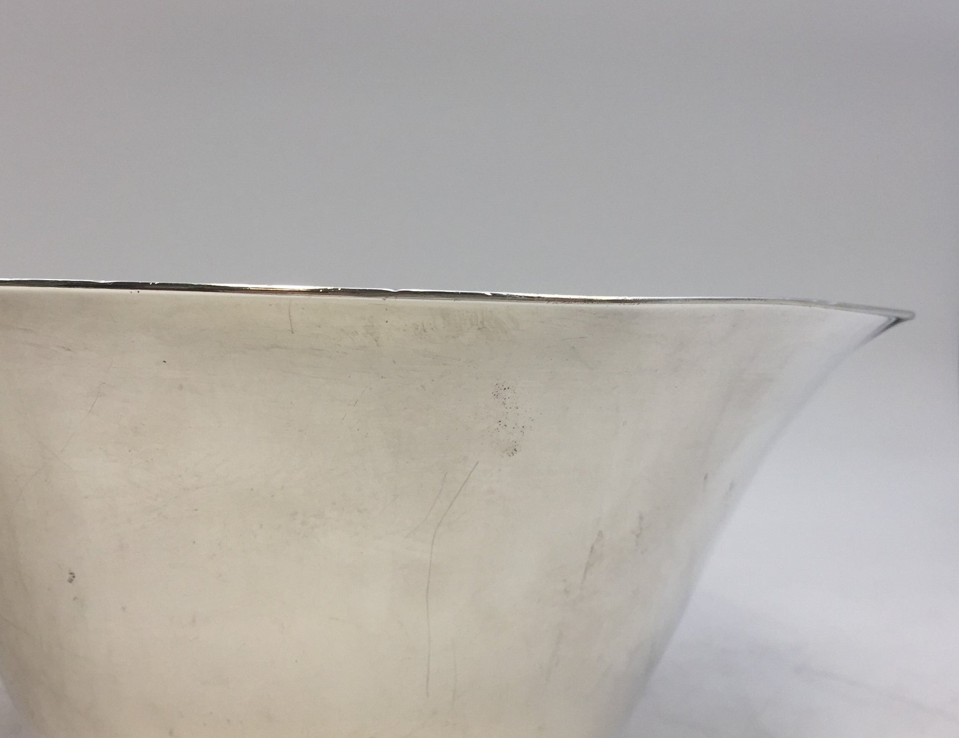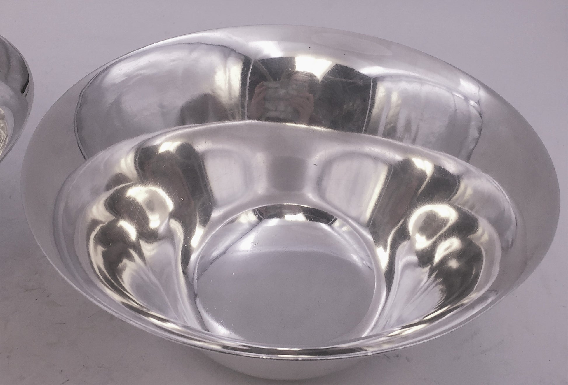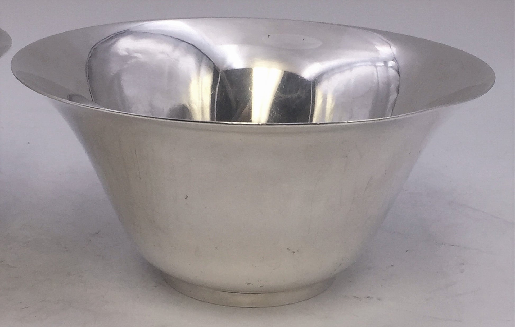 Pair of Tiffany & Co sterling silver modern bowls in bell form and in simple classic style with short base. Measuring 4 1/2 inches tall and 9 1/4 inches in diameter at top. Total weight is 62 troy ounces. Pattern 16667F from 1906. Bearing hallmarks as shown in images.