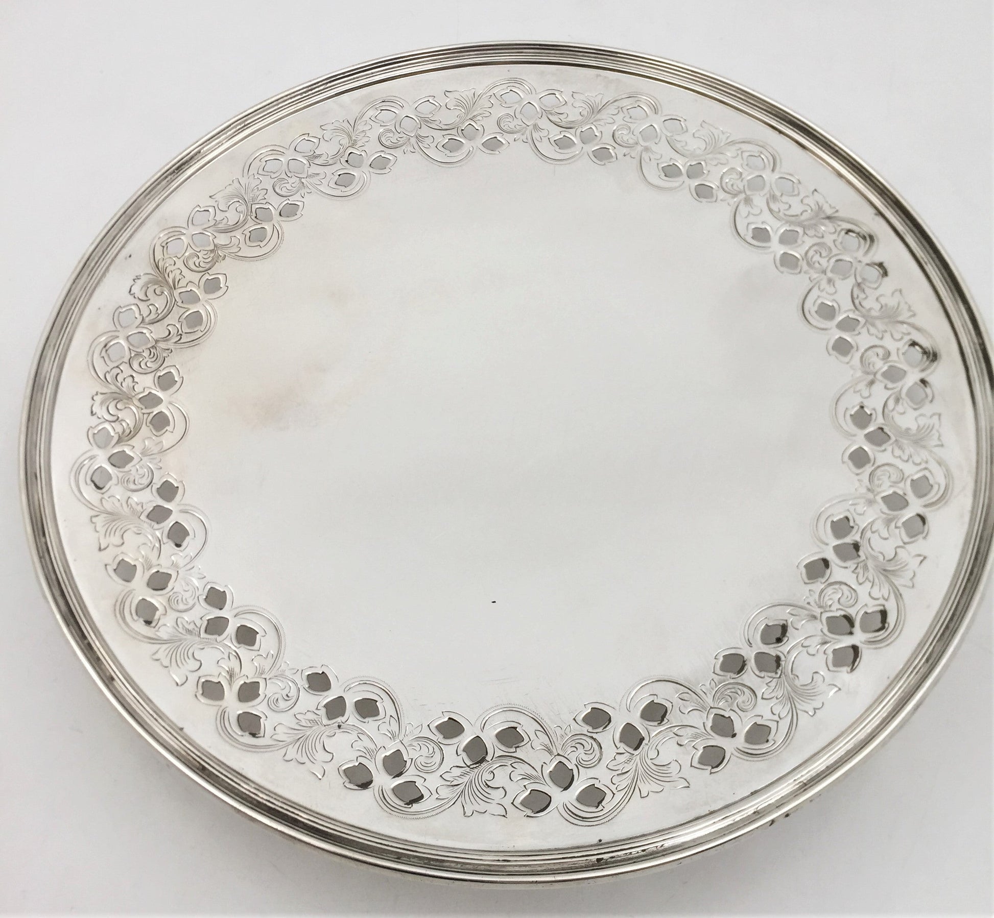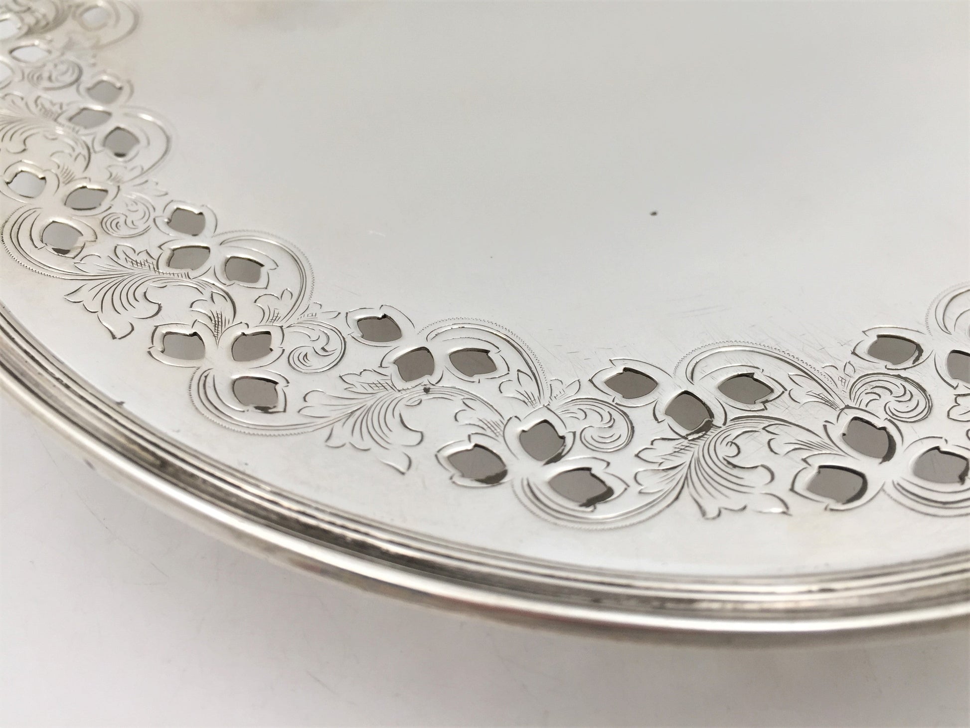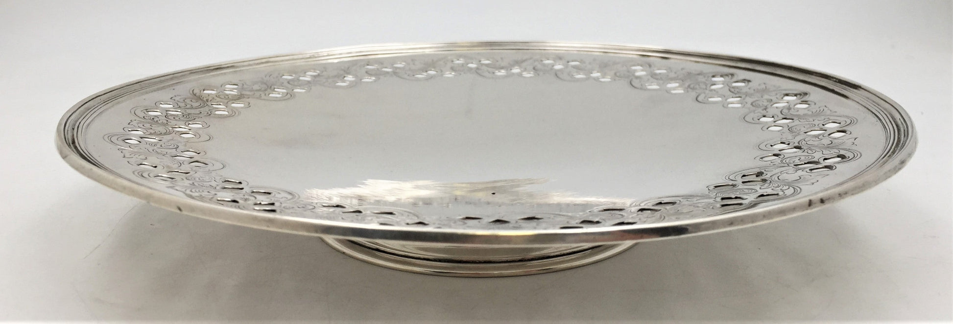 Tiffany & Co. sterling silver footed platter or compote in exquisite Art Nouveau style with pierced and engraved leaf motifs in stylized manner and in pattern number 16971A from 1907. It measures 10 1/2'' in diameter by 1 2/3'' in height, weighs 20.6 troy ounces, and bears hallmarks as shown.