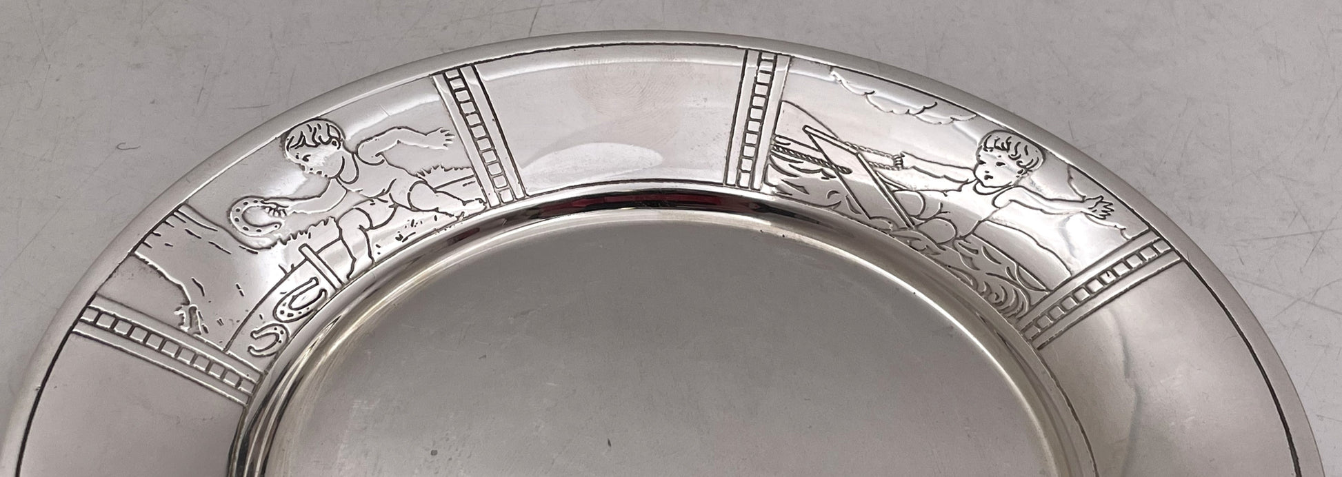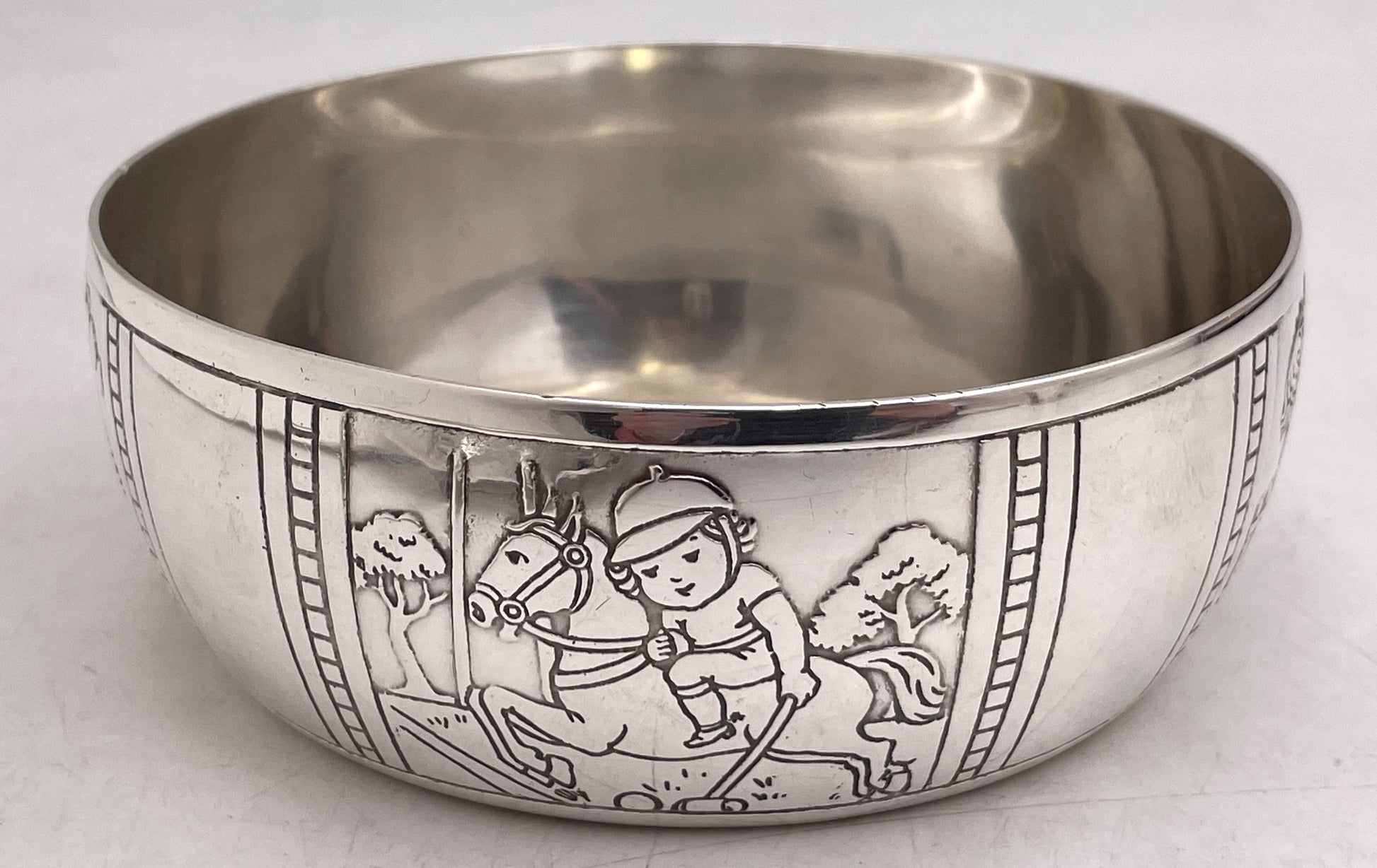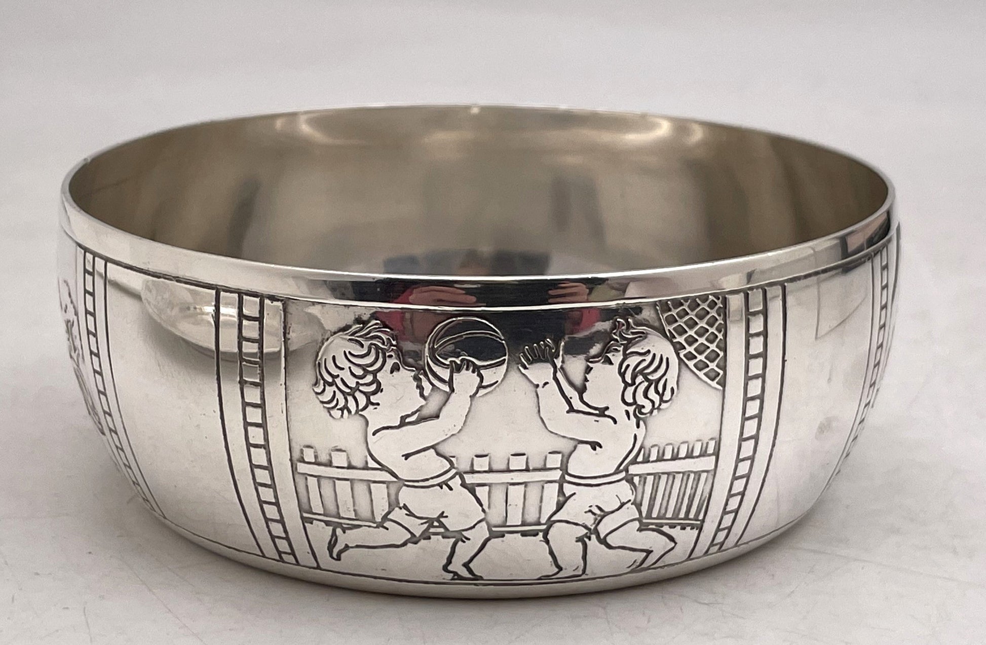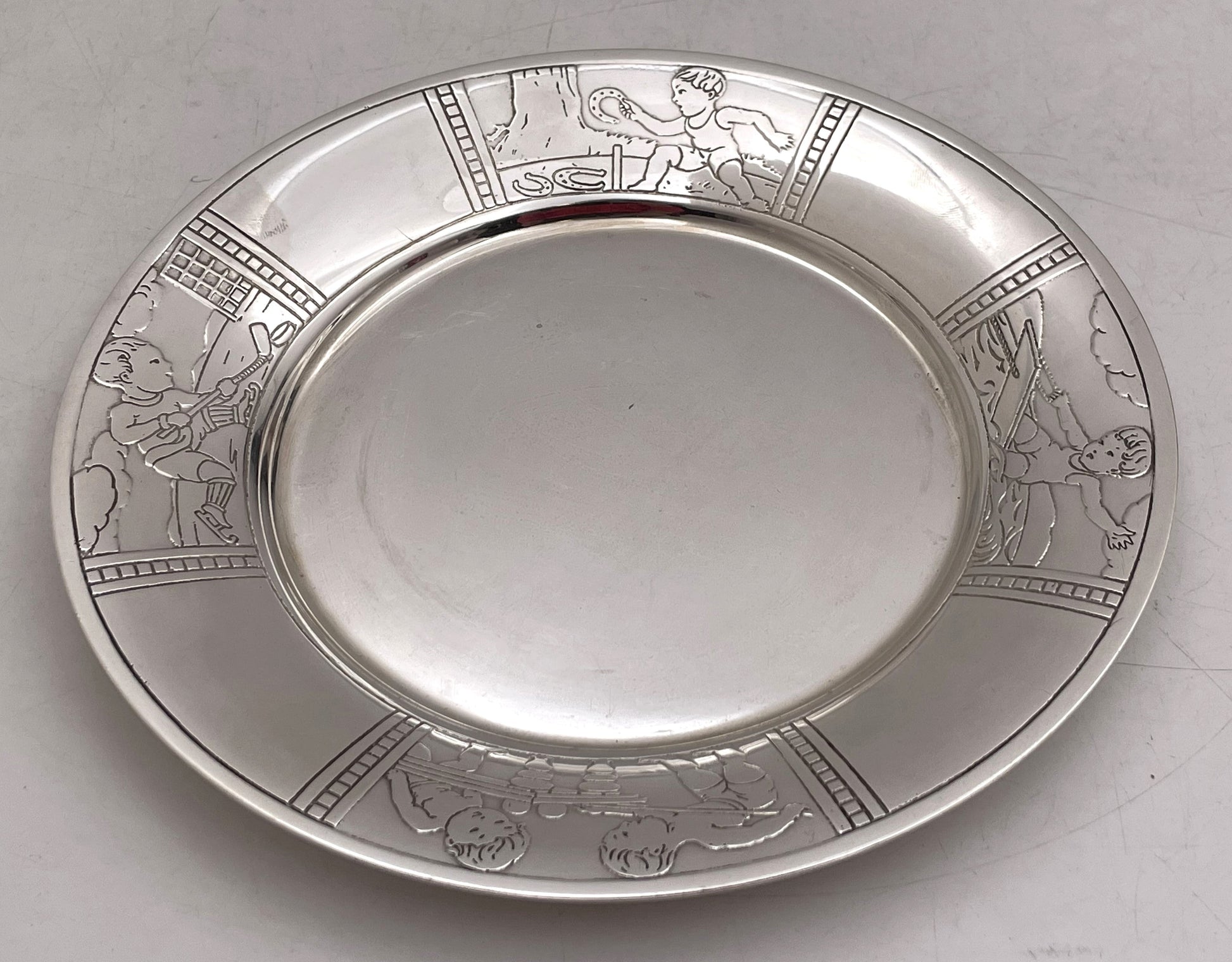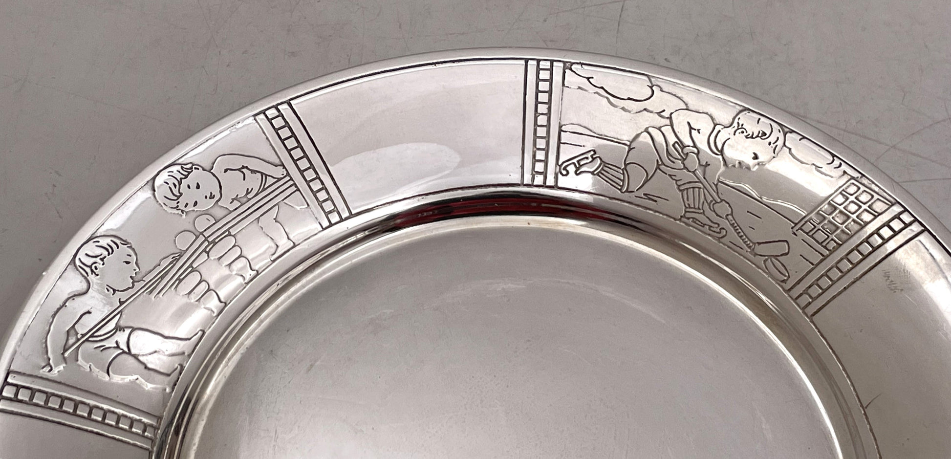 Tiffany & Co. sterling silver child bowl and underplate, showcasing boys playing various sports, and in Art Deco style, with an elegant geometric design. The design is from 1927 (pattern number 20850B) but the set was made between 1943 and 1945. The bowl measures 5 1/8'' in diameter by 2'' in height while the underplate measures 7 1/2'' in diameter. Total weight is 17.5 troy ounces. Hallmarks are shown.