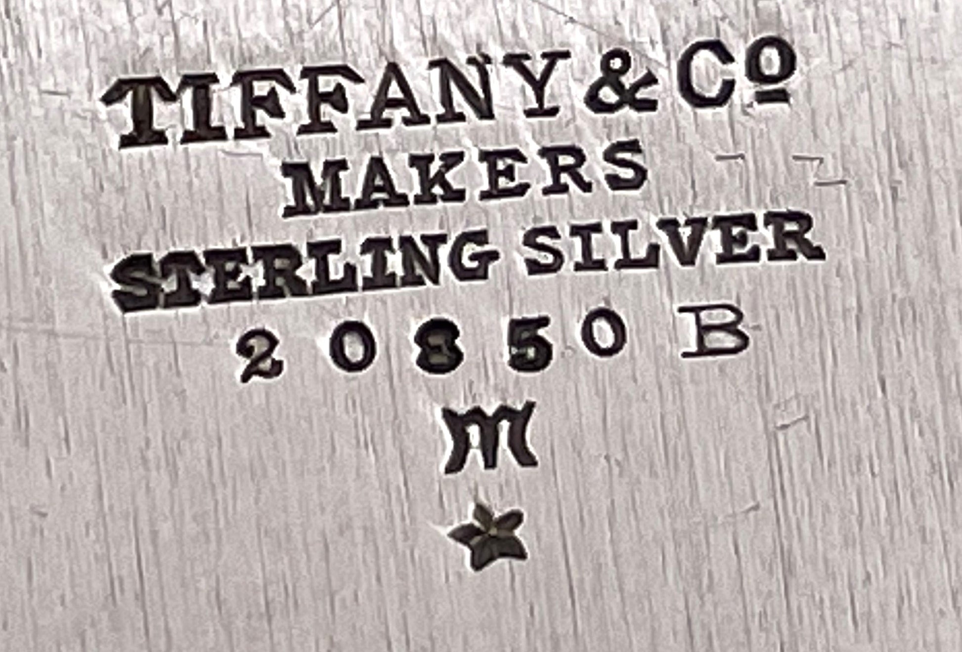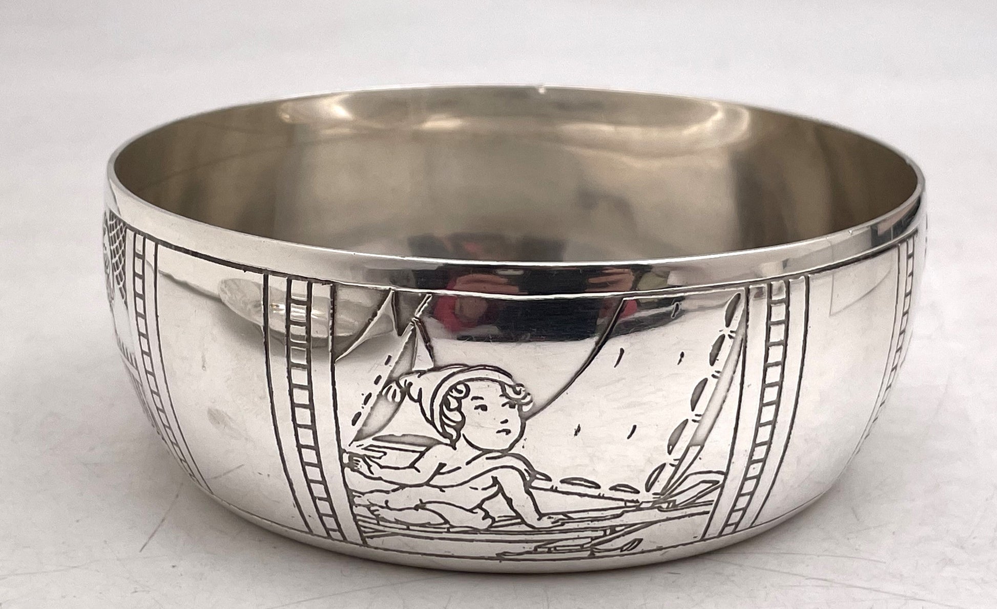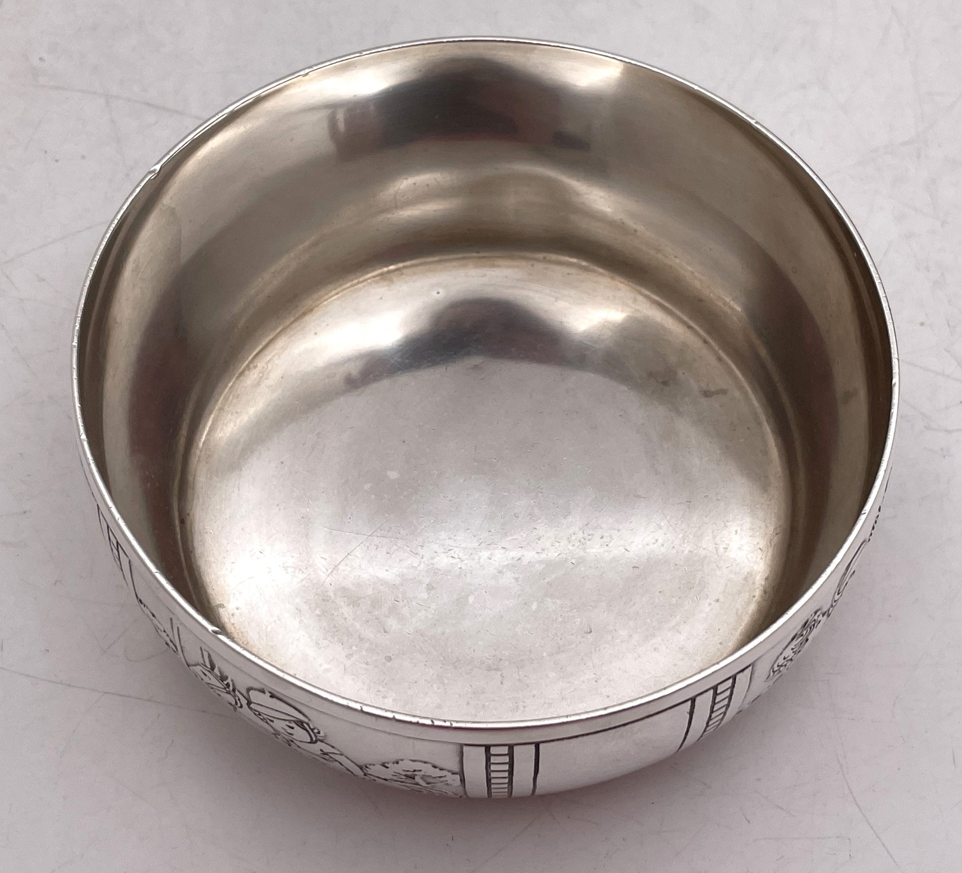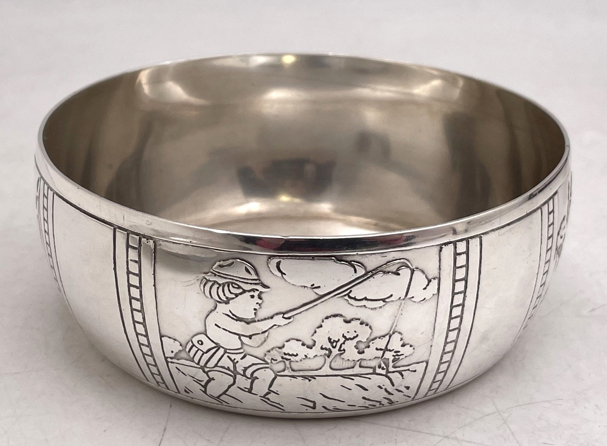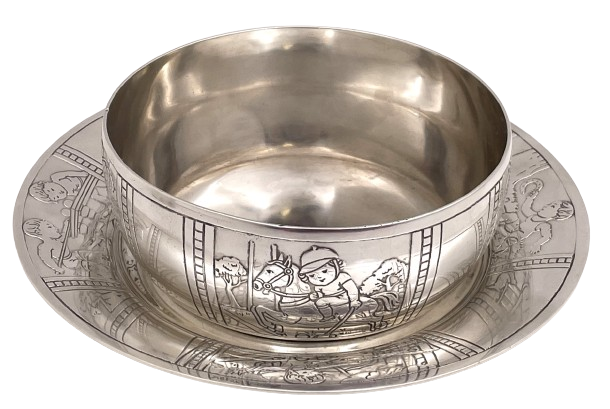Tiffany & Co. sterling silver child bowl and underplate, showcasing boys playing various sports, and in Art Deco style, with an elegant geometric design. The design is from 1927 (pattern number 20850B) but the set was made between 1943 and 1945. The bowl measures 5 1/8'' in diameter by 2'' in height while the underplate measures 7 1/2'' in diameter. Total weight is 17.5 troy ounces. Hallmarks are shown.