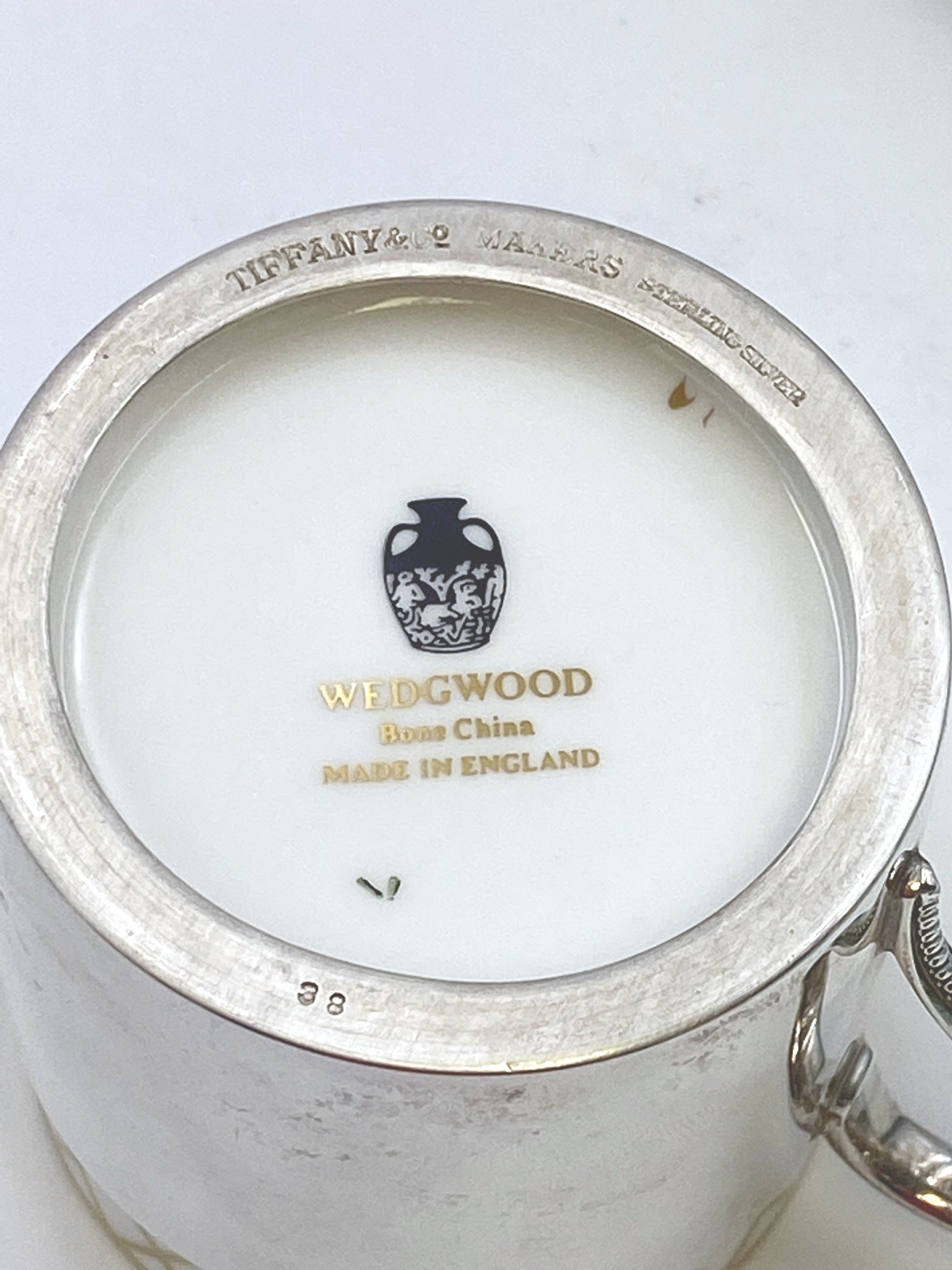 Tiffany & Co. set of 3 of sterling silver coffee/cappuccino cups and saucers with Wedgewood bone china inserts. Each insert has a gold pattern circling the part visible from the cup. Each cup measures approximately 2 1/4 inches wide (3 1/8 inches including handle) and 1 3/4 inches tall. The inserts measure approximately 2 3/8 inches wide and 2 5/8 inches tall. The saucers measure approximately 5 inches wide and 1/4 inch tall. The set weighs a total of 17.4 troy ounces of silver. The outer cup of hallmarked Tiffany&Co Makers Sterling Silver, 36. The insert is marked Wedgewood, Bone China, Made in England. The saucer is hallmarked Tiffany&Co, Makers, Sterling Silver, 88687.