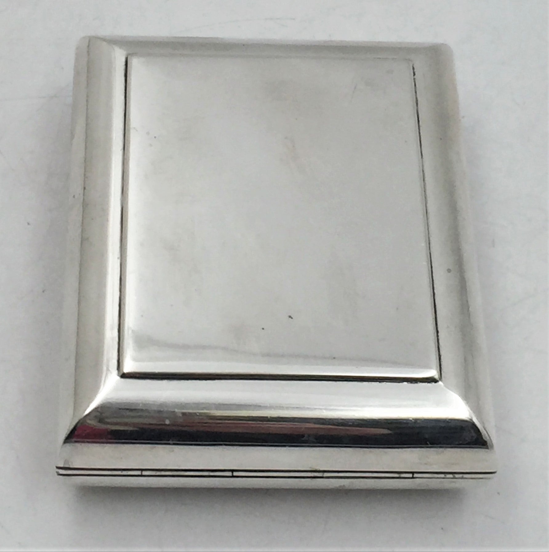 The clock measures 45mm in diameter while the case measures 3 1/4'' in length by 2 3/4'' in width by 3/4'' in height. Hallmarks are shown.