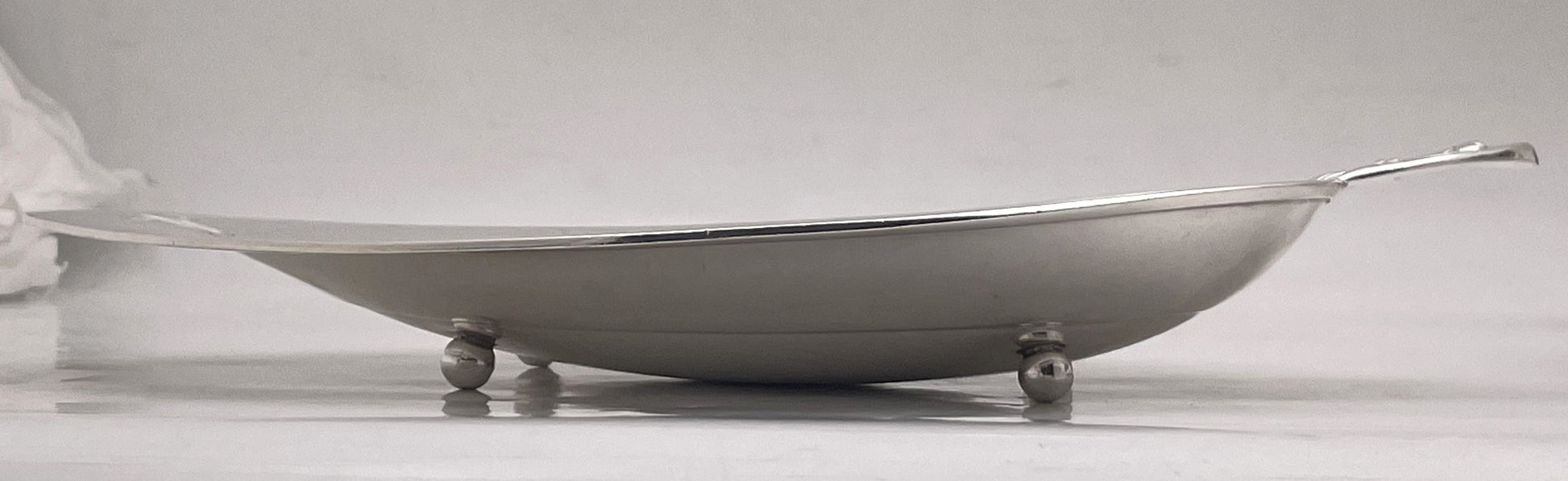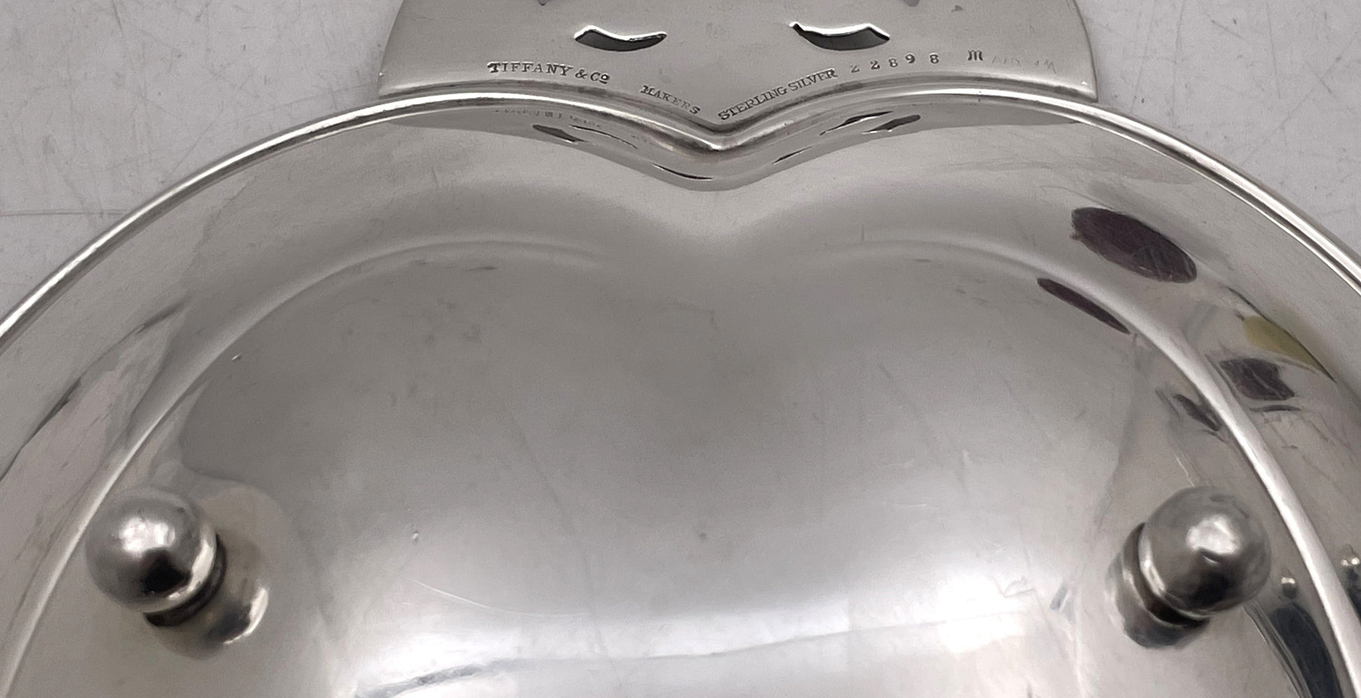 Tiffany & Co. sterling silver heart-shaped dish in pattern number 22898 from 1940 and in Mid-Century Modern Style, with an elegant, geometric design, standing on 4 balled feet. It measures 10 1/2'' in length by 6 7/8'' in width by 1 3/4'' in height, weighs 10.4 troy ounces, and bears hallmarks as shown.