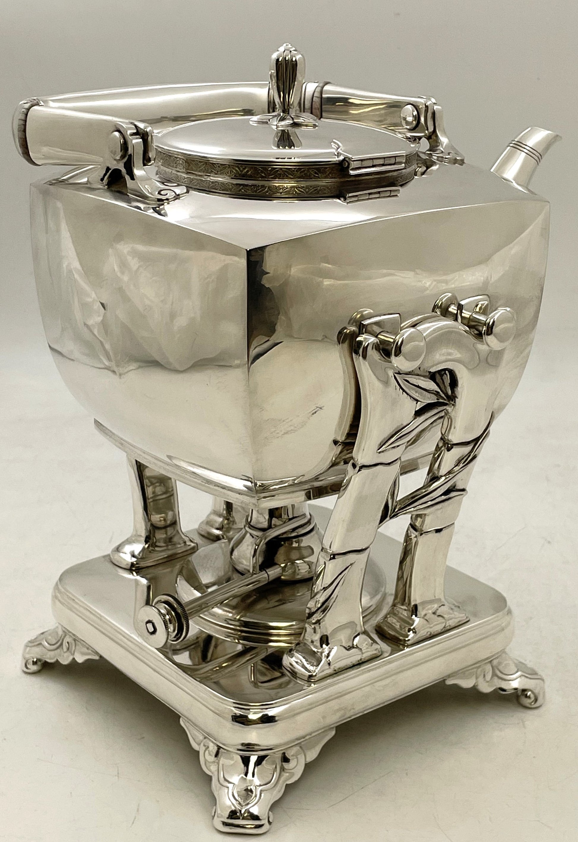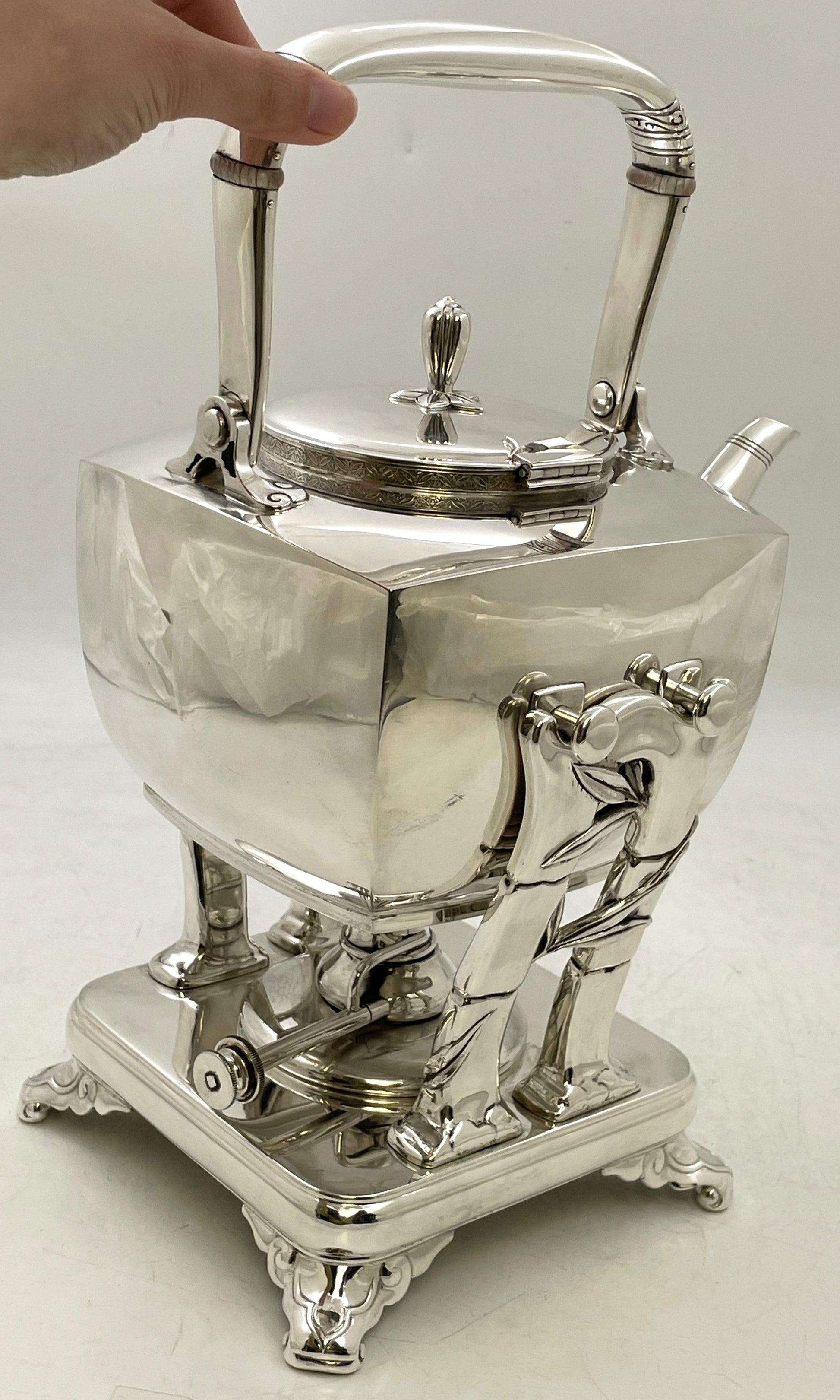 - a kettle on stand measuring 14'' in height (with lifted handle, 11'' with handle spout) by 9'' from handle to spout by 6 1/2'' in depth