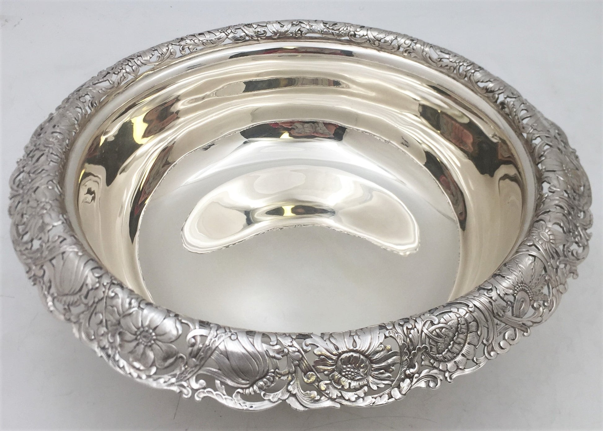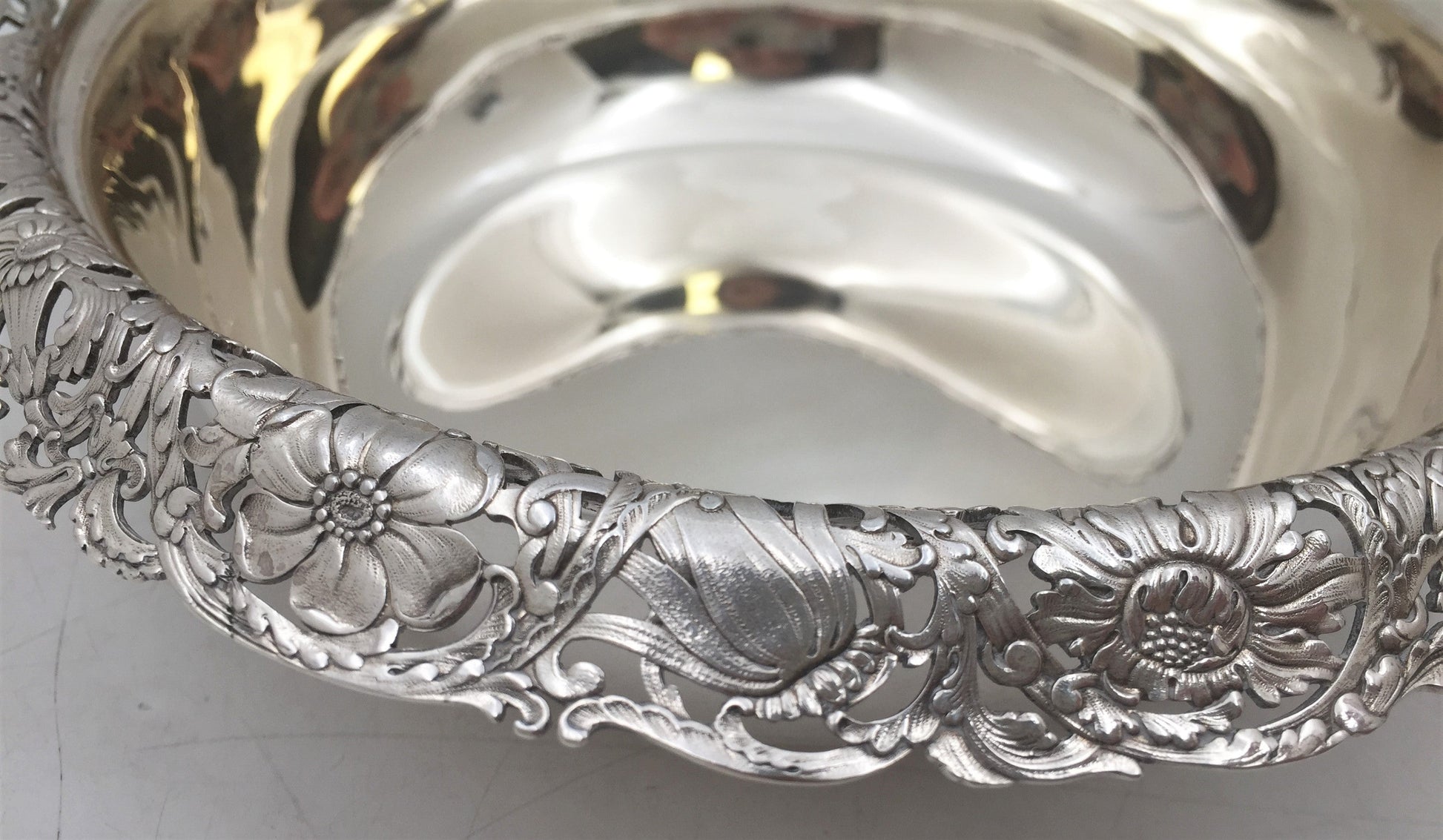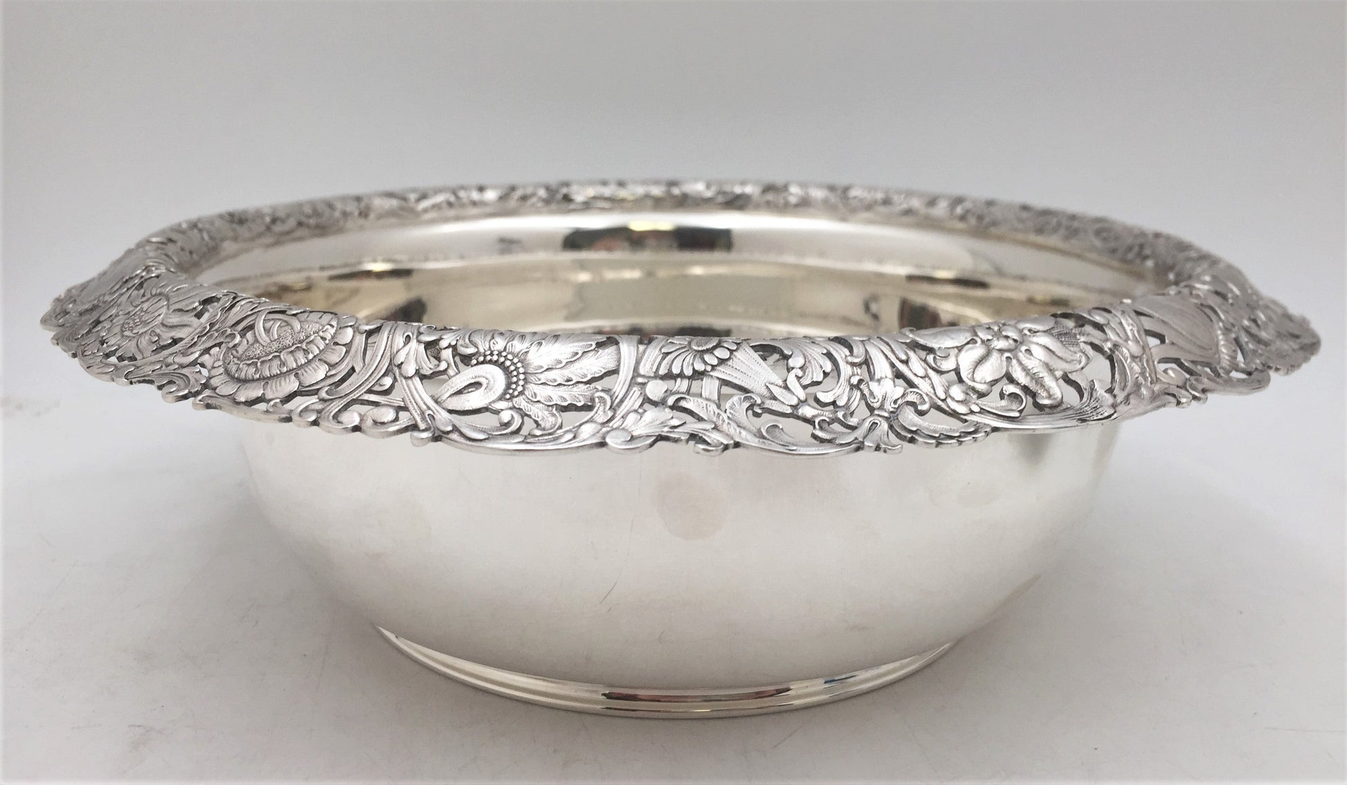 Tiffany & Co. sterling silver bowl in pattern number 9460 from the 1890s, in Art Nouveau style with flowing floral and palmette design adorning the rim. It measures 10'' in diameter by 3 1/8'' in height, weighs 21.8 troy ounces, and bears hallmarks as shown.