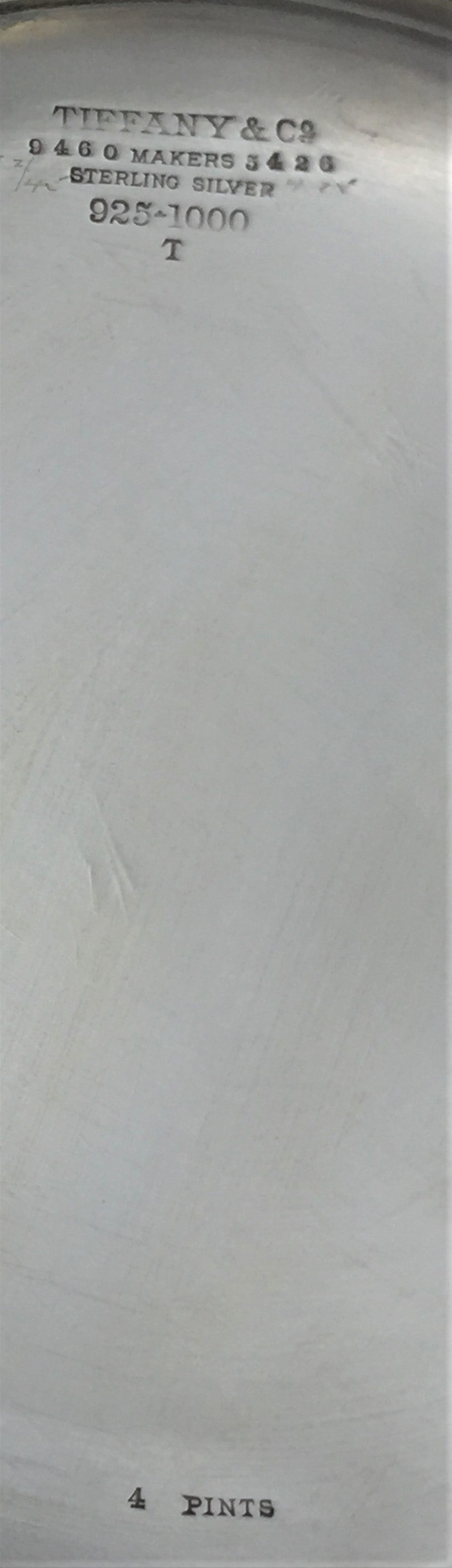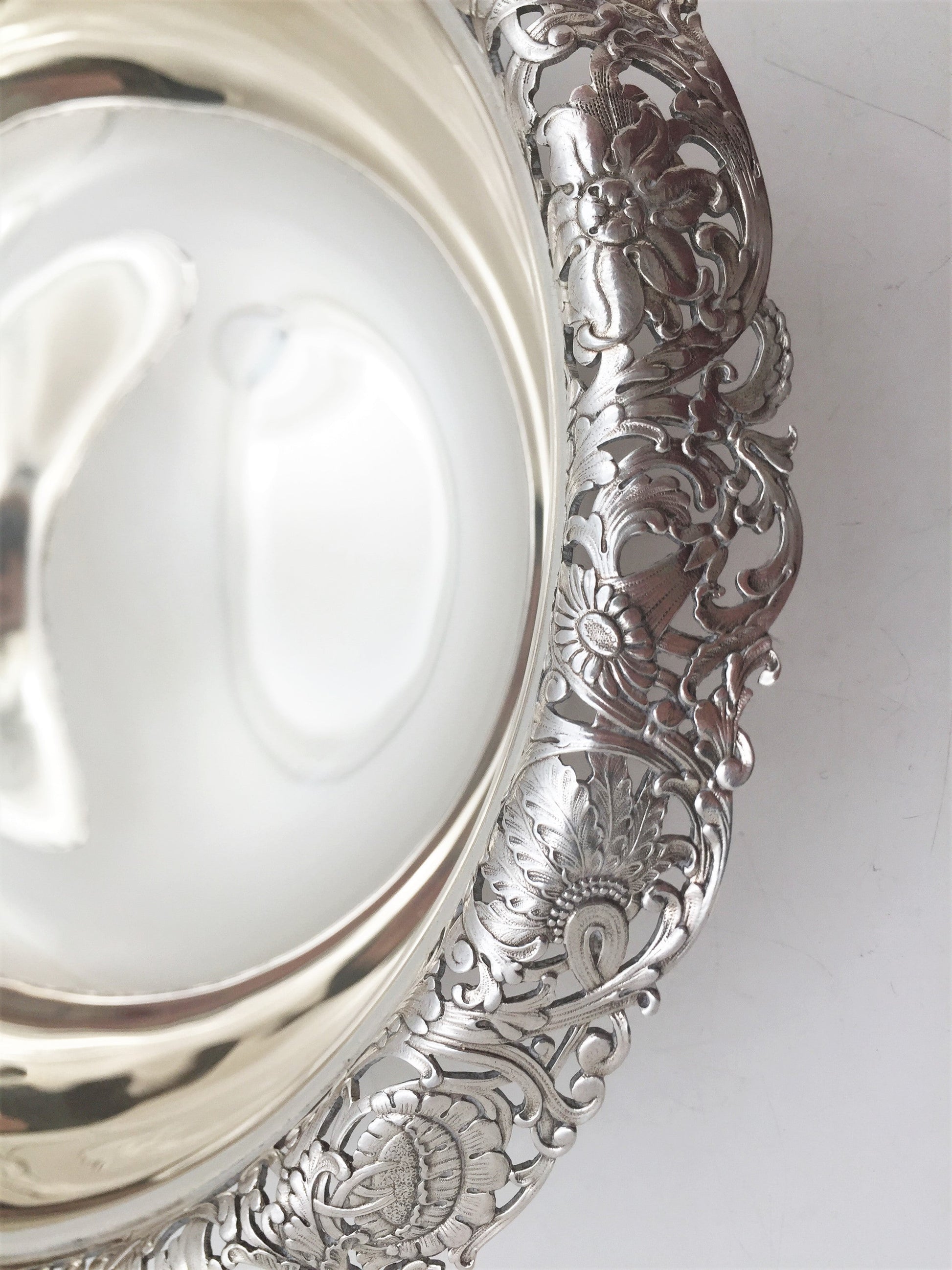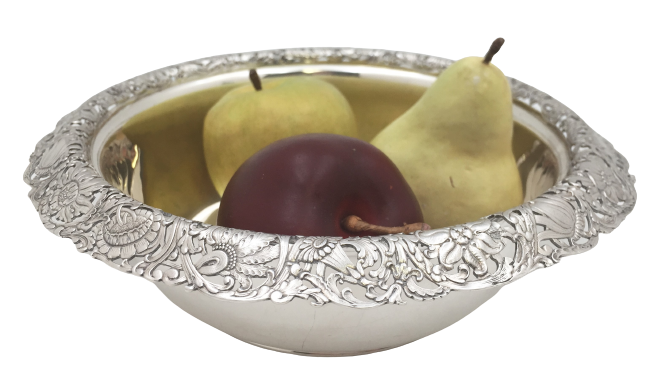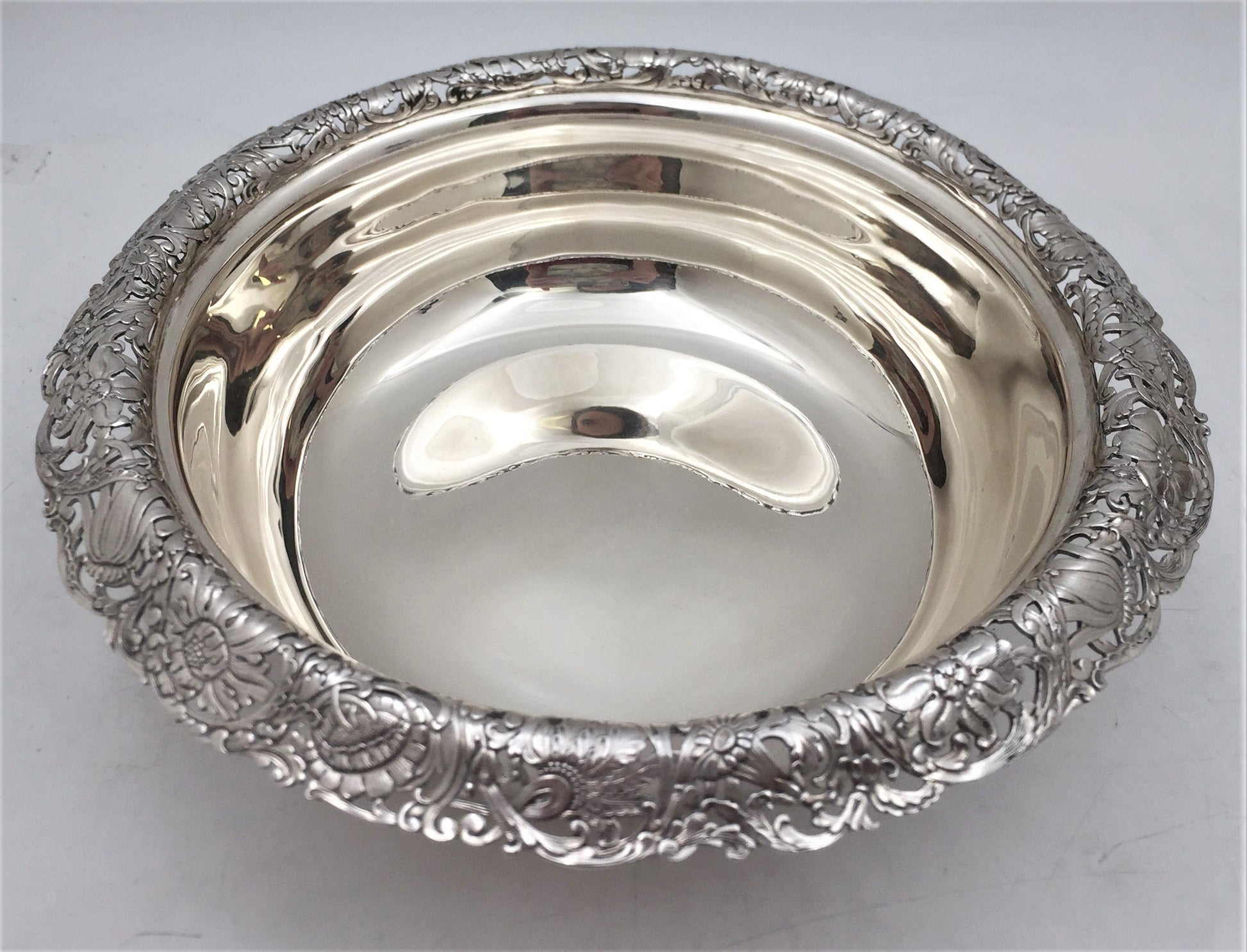 Tiffany & Co. sterling silver bowl in pattern number 9460 from the 1890s, in Art Nouveau style with flowing floral and palmette design adorning the rim. It measures 10'' in diameter by 3 1/8'' in height, weighs 21.8 troy ounces, and bears hallmarks as shown.